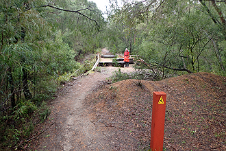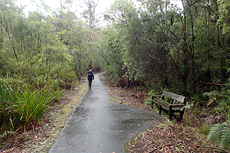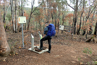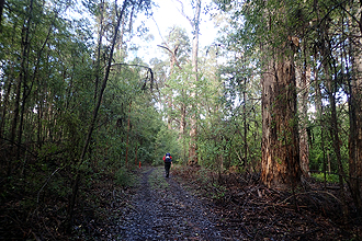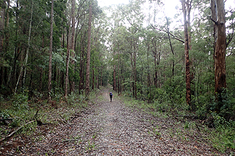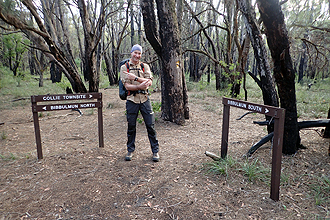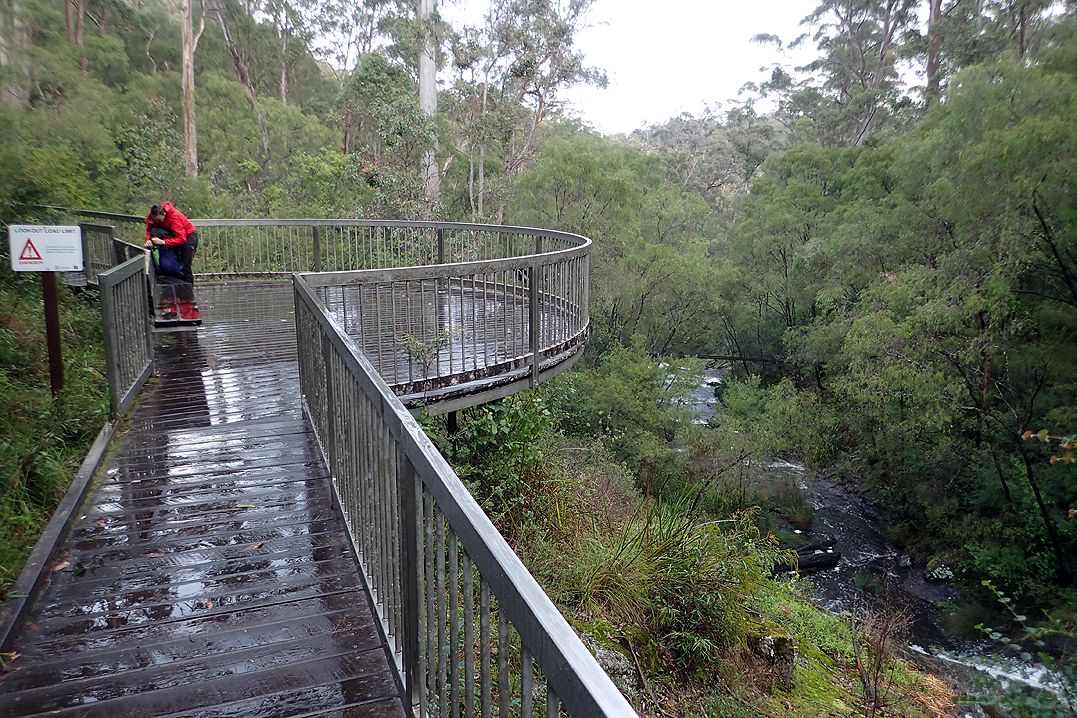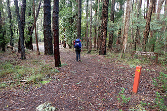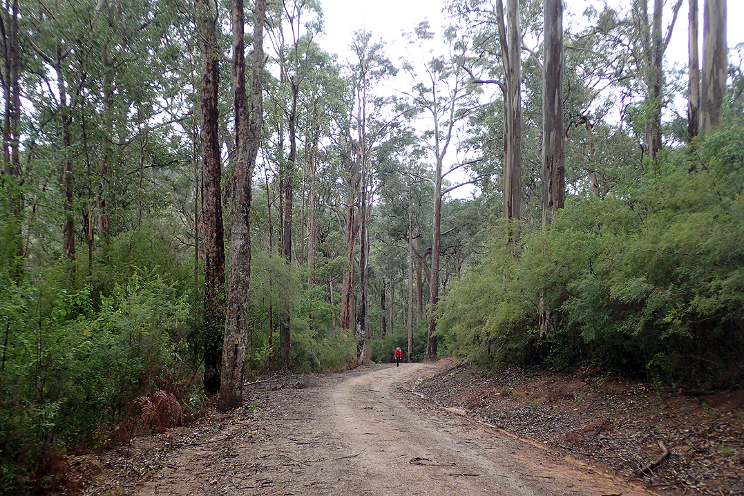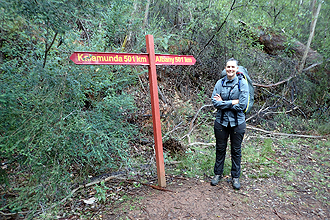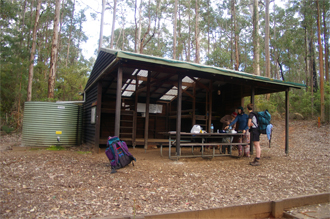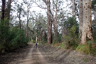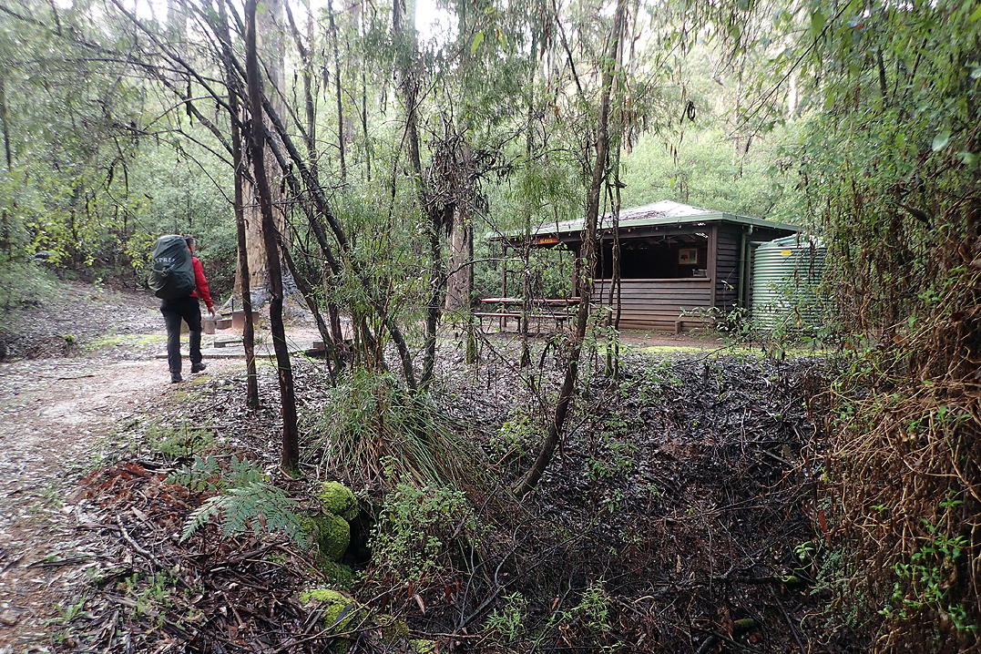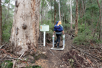 This morning we suddenly came upon the sign indicating we were halfway! The next two days would be tough, unbeknownst to us we had arrived at the "Rollercoaster" which is what people who do their pre-reading on the Bib before doing it, call the continual steep up’s and down’s from here to Pemberton. For us this was made worse by heavy rain which started just after our lunch stop (at Boarding House Hut) and an encounter with a crazy kangaroo who wanted to attack us until Mike showed him who was boss with the help of a large tree branch. Large being relative in this part of the world!
