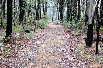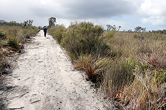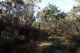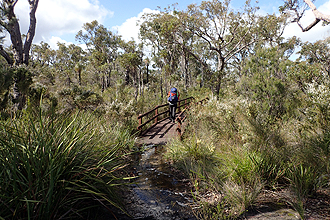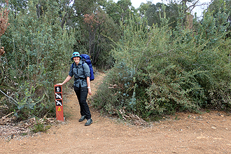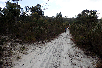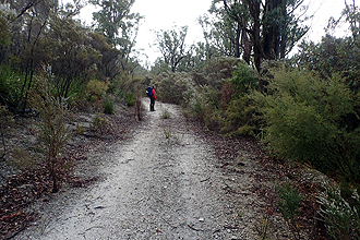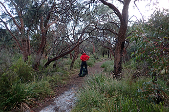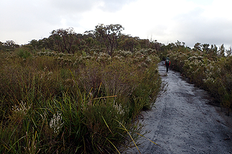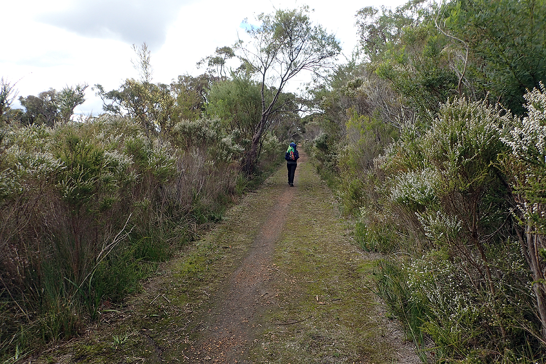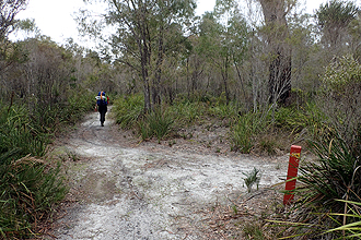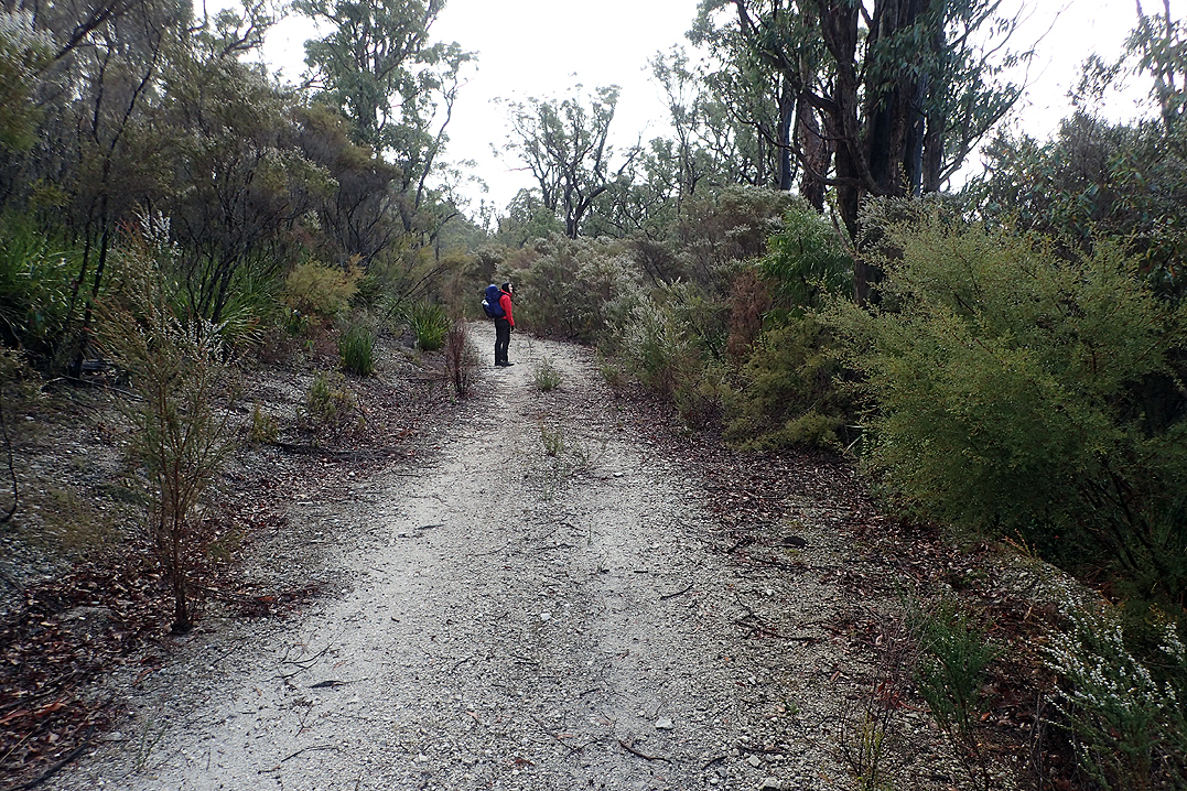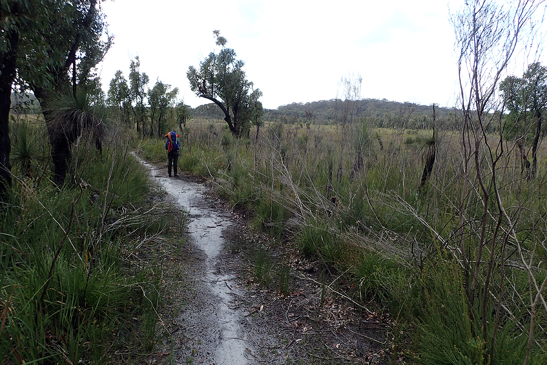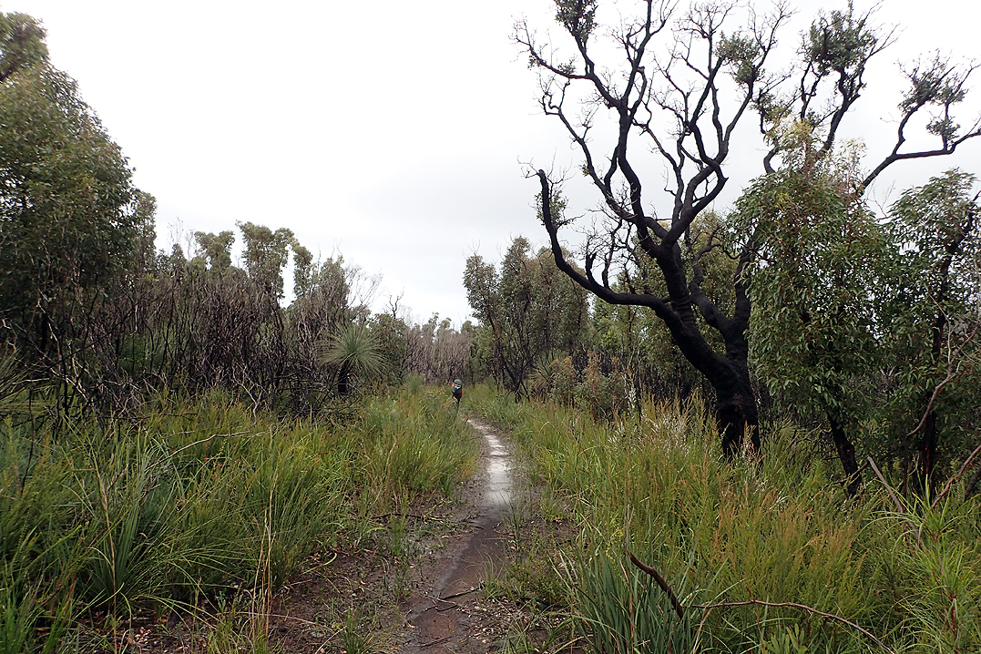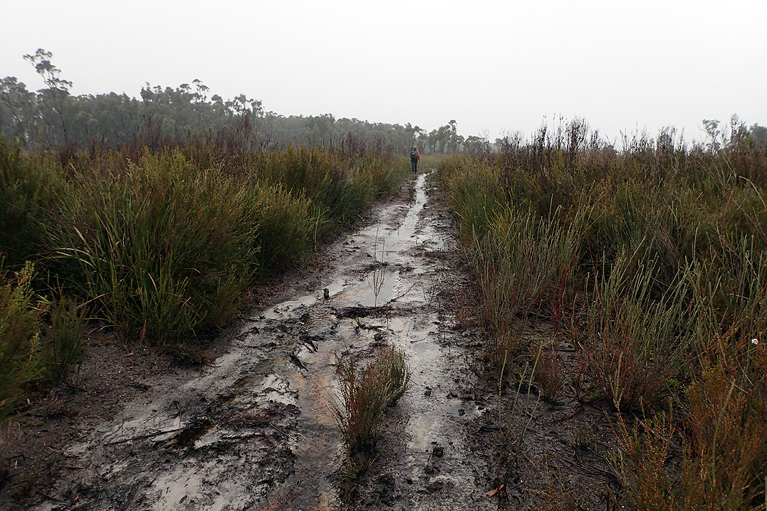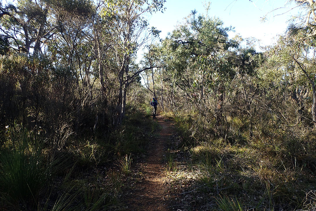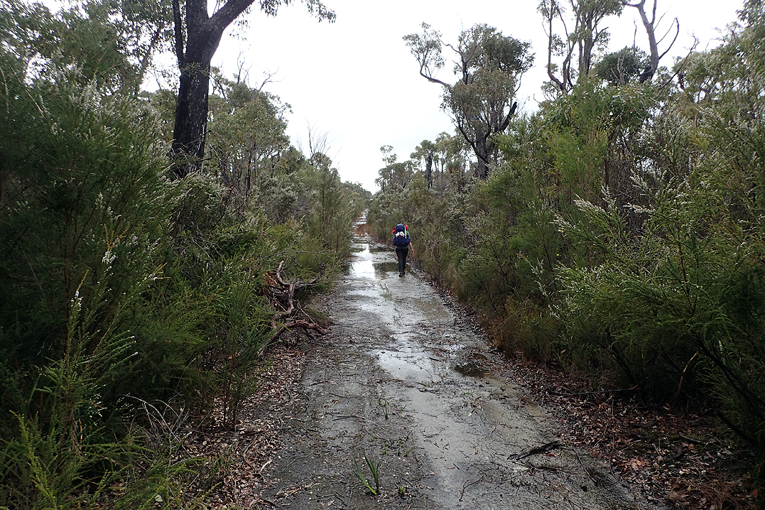 There was a hiker in front of us with a track name of Shoots. He had a walking partner earlier who had had to leave the track and go back to work. As conditions were so wet and the track was sandy it was easy to discern footprints. We worked out which footprints were his and it was somehow a nice feeling to be following them through the puddles. Following in his footsteps made us feel we weren’t the only crazies out there! Apart from Shoots’ footprints, the wonderful scent of Boronia’s which had started to bloom along the puddle edges carried us through.