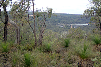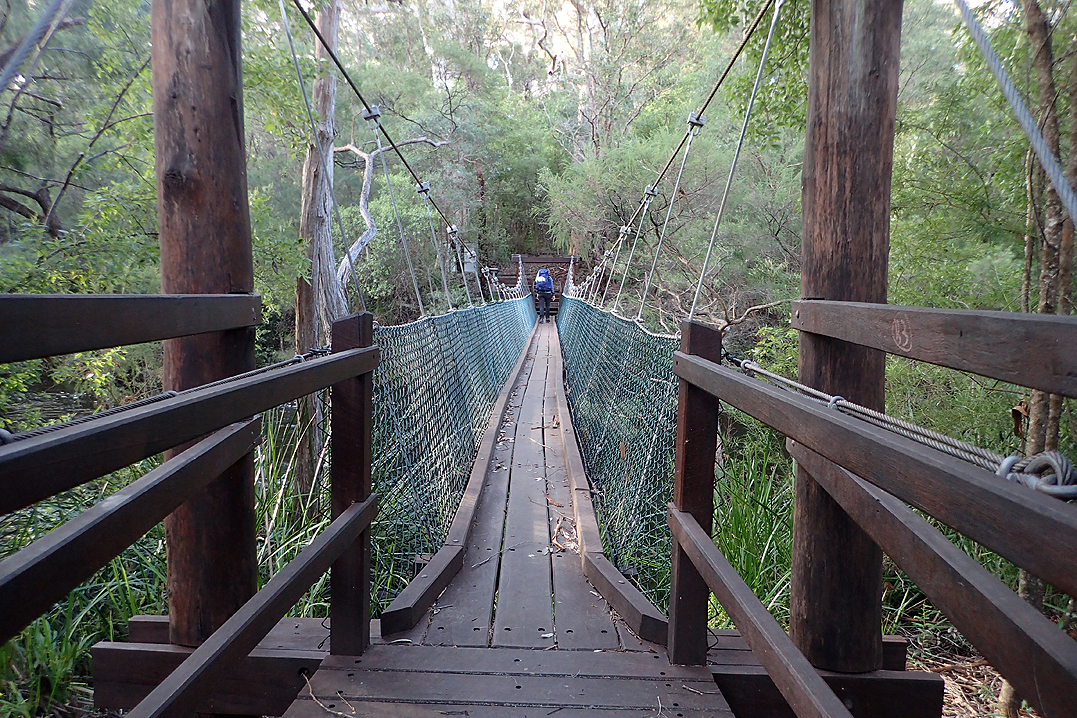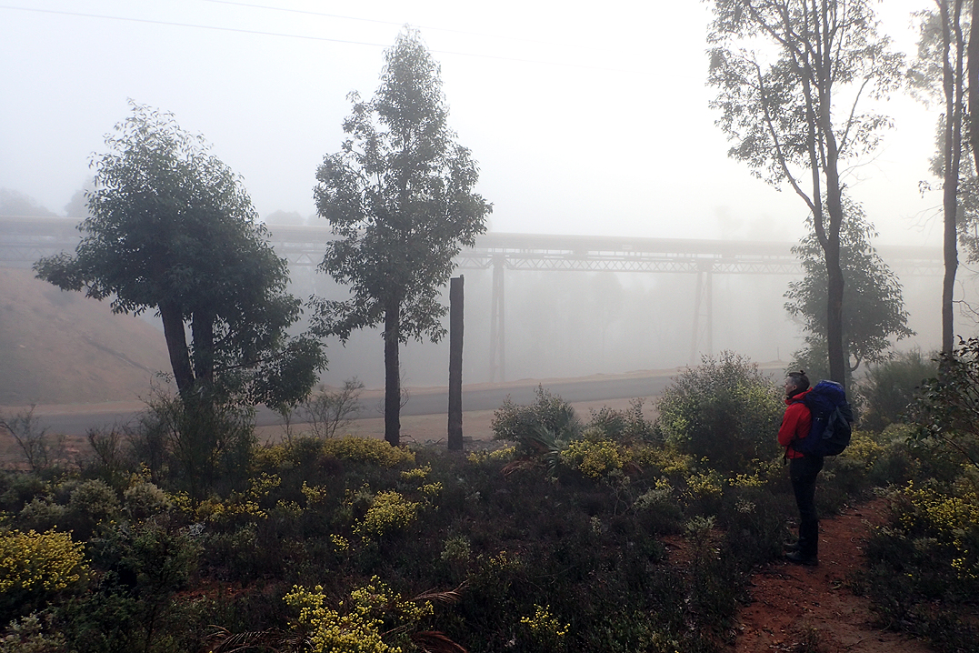We were starting to settle into our "distance rhythm" by now. For us 26-28km is a good daily distance. Our best advice to anyone undertaking this hike is "Pick your distance. Repeat it day after day after day no matter where it ends up". It was a misty morning. We had heard an industrial sound all night and it was a conveyor belt for Worsley Alumina mine. We walked underneath it in the morning. Many of the trail is bordered by hakea bushes whose yellow flowers seem to be luminous in the mist or in low light. We found this amazing. In normal sunlight they were just a lemon yellow, but in early mornings they actually glow.