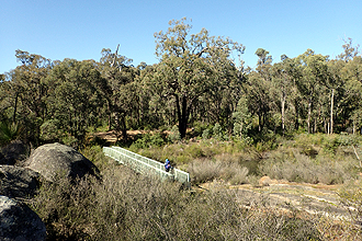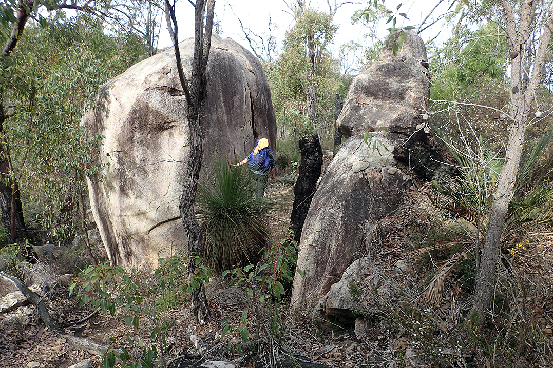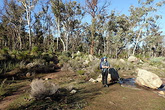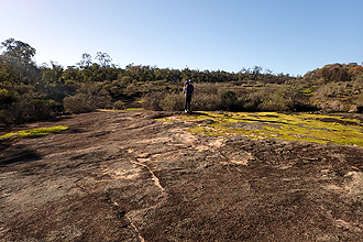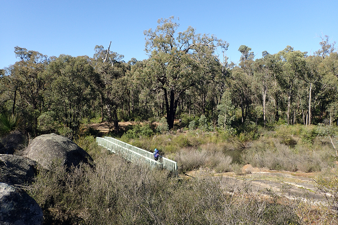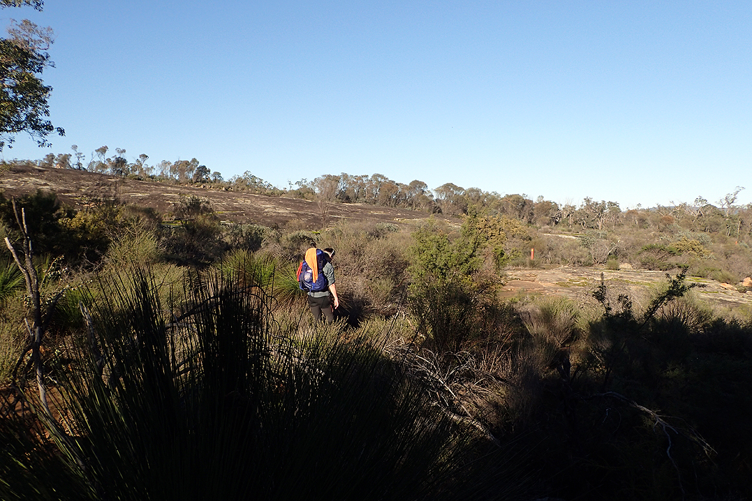 Crossing Brookton Highway was the first milestone of the hike. Shortly after that while crossing one of the great dome rocks we found a perfect pool, it was deep and clean. Mike got into it with his inflated mattress and like the seasoned cycle tourists that we are, we soon spotted the trail of teeny silver bubbles that gave away the puncture. We used one of the two patches that come with the mattress and set off again. Crisis averted. This kind of drama never happens with Thermarest!