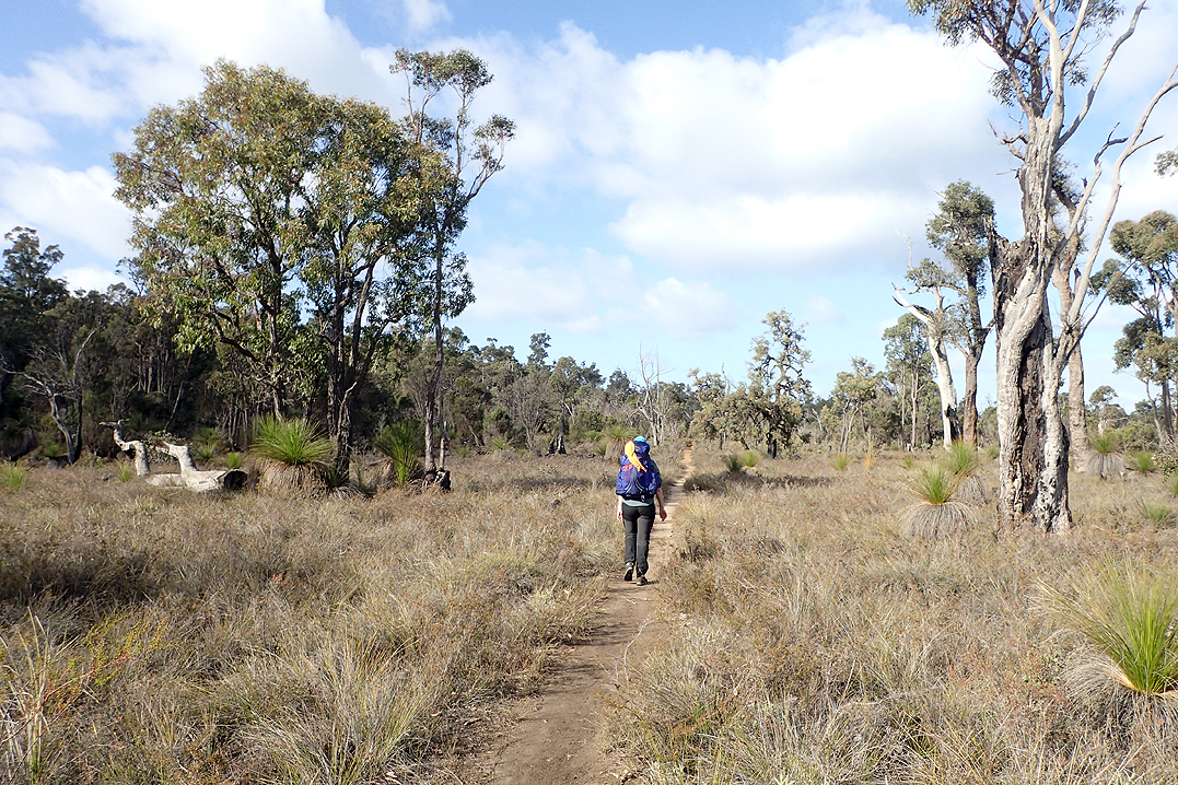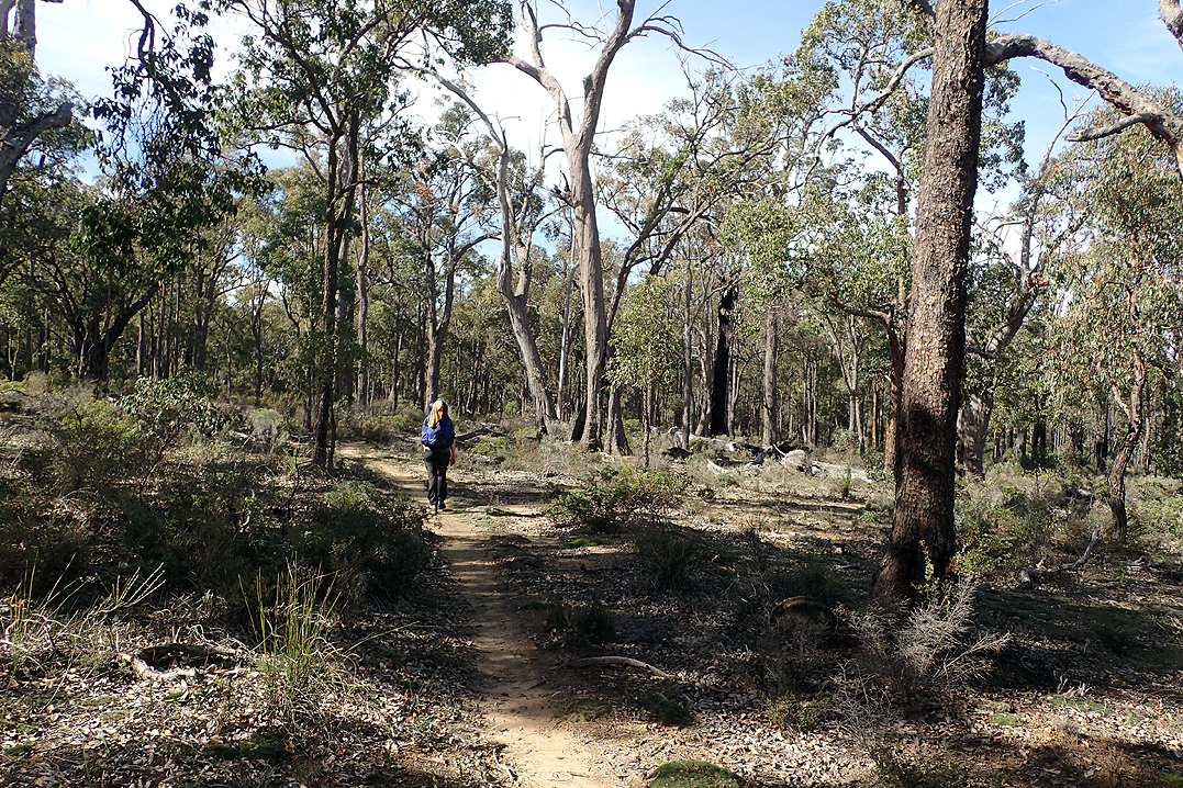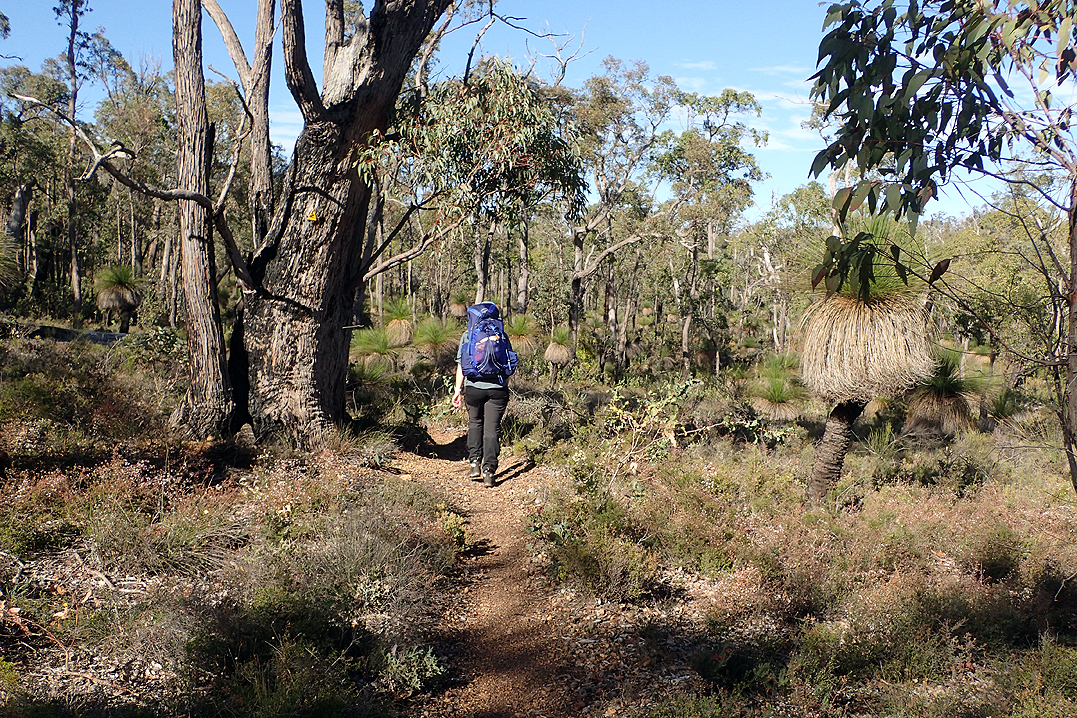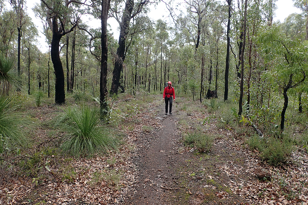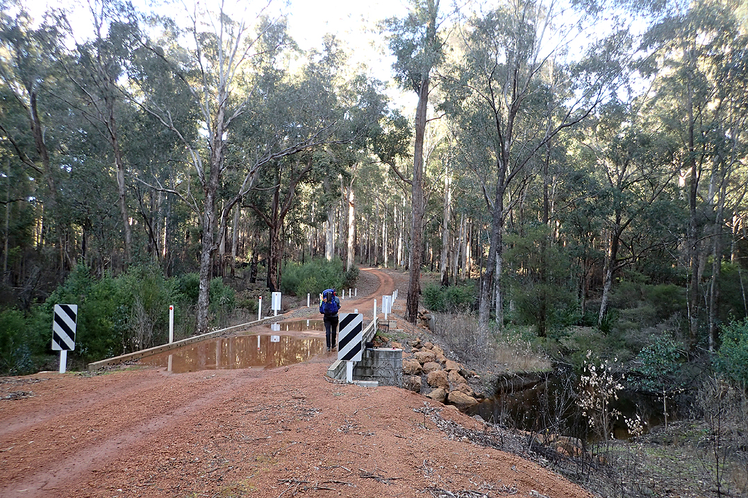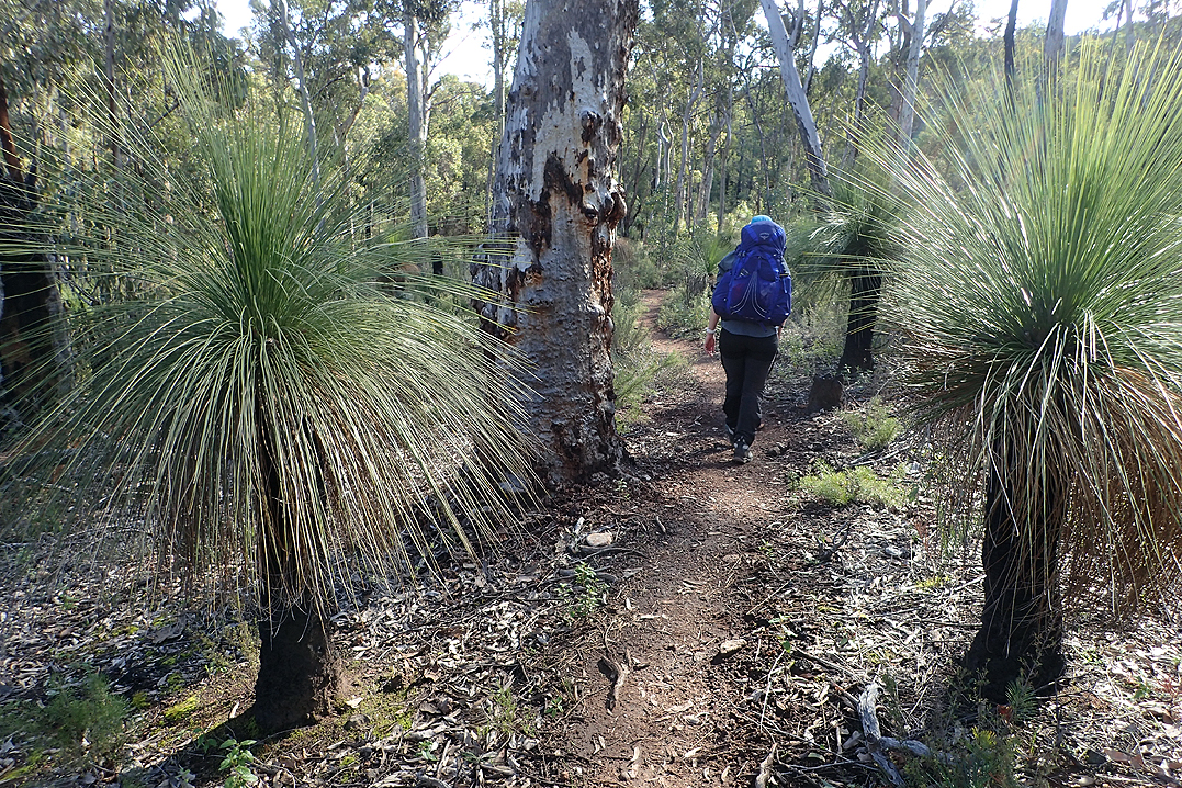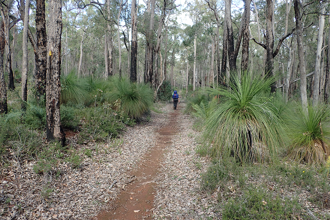 Beautiful walking today, much of it through virgin Jarrah forest and then later on along an old rail trail track. We met a Northbound E2E guy who warned us about the wet trail conditions further south and recommended accommodation in Ballingup. We found overall that the two things went hand in hand; someone told you horror stories about waist deep water, carrying your packs over your head, rats running over you while you slept and in the next breath told you all the B&B’s they had stayed in with hot showers and heaters.
