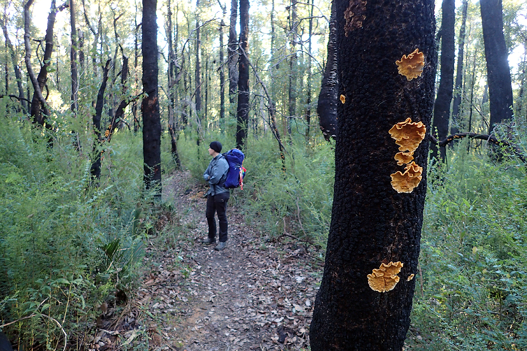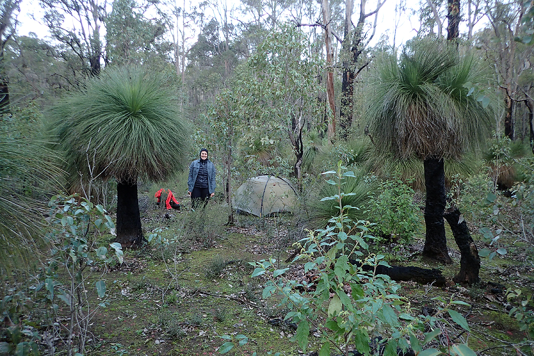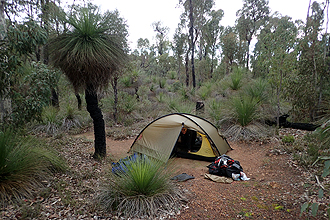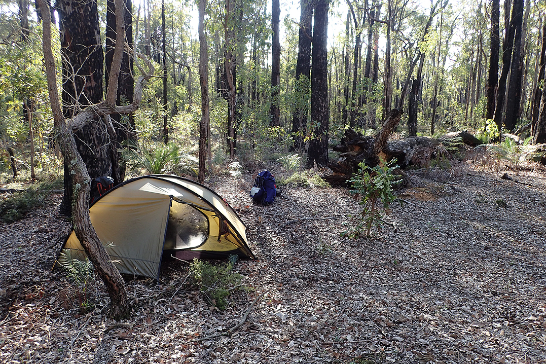 We arrived at Ball Creek Campsite at 16:30 and met Jordy, who had End to Ended (E2E) from Albany and this would be his last night on the trail. He offered us various things eg. A herbal tea which you could also smoke and would help you relax?! We declined, best not to try something new at this point. Kim was also camping at the hut, having walked a few days in the local area. They sat up late into the night talking at the fire,burning a dead grass tree which lasted for hours. We hit the sack in our new tent after inflating our new Nemo mattresses which seemed impossibly light (and proved to be just that) and lowered ourselves gingerly onto them.