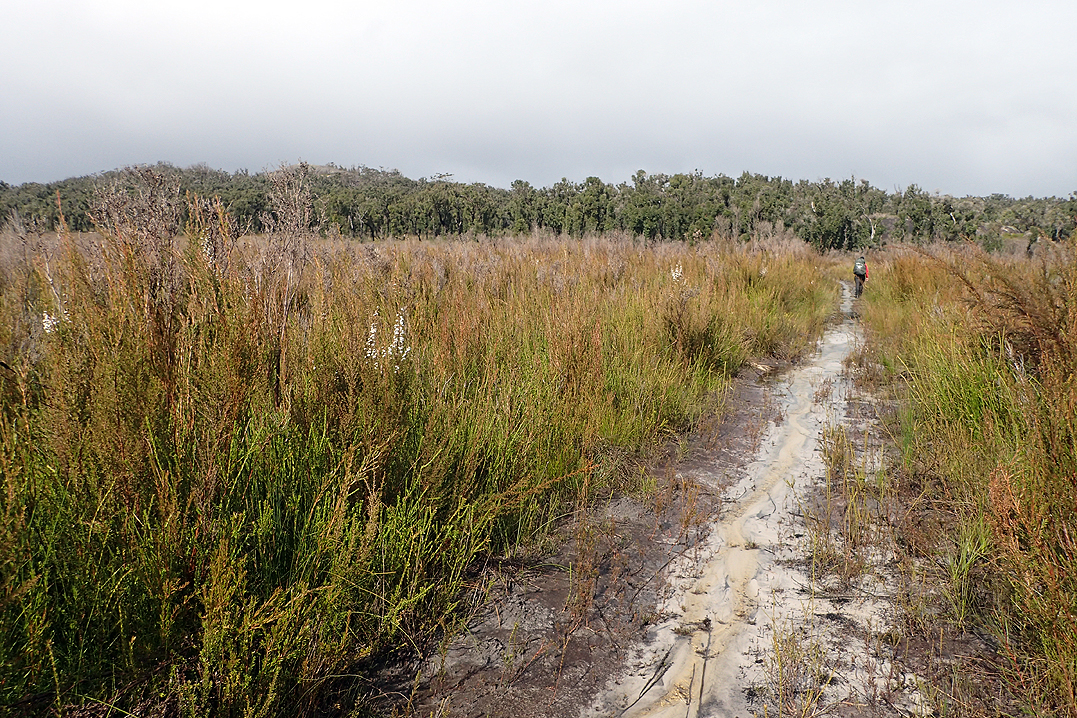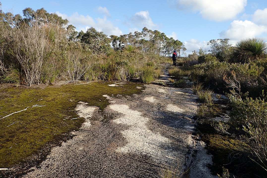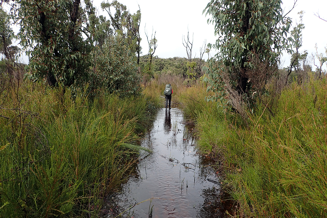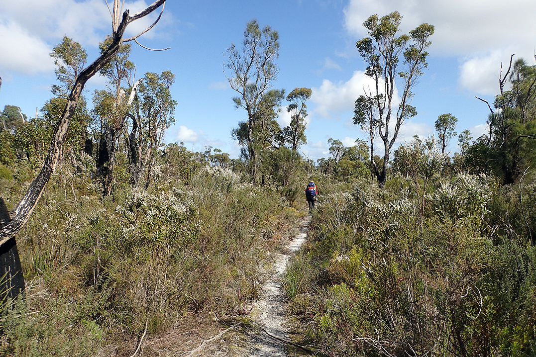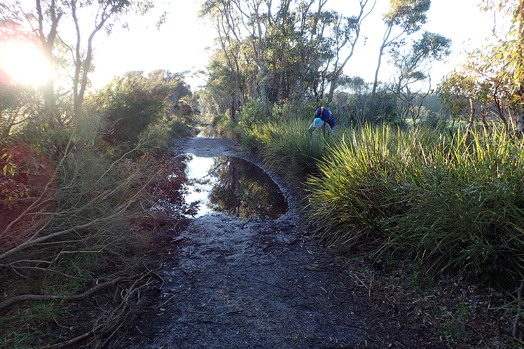 Today's walk introduced us to wading through puddles! The path was often inundated by multiple pools which were difficult to get around and deep enough to require the removal of boots, socks and pants. Luckily this entire section is across sandy plains so it is comfortable under foot, especially when you can’t see the bottom through whiskey-coloured water. The water was usually cold and the pools were full of tadpoles. The frog chorus is the sound of this section, it never leaves you, from the sentinel frog who waits by the path and emits a warning to the rest, to the sound of hundreds croaking together. Day and night. The track passes through the beautiful D'Entrecasteaux National Park.