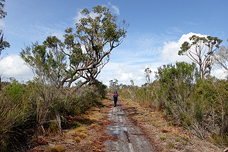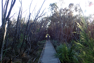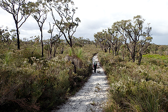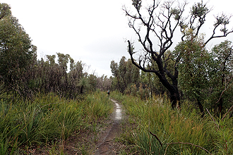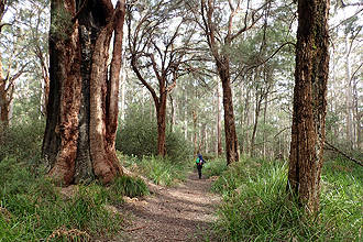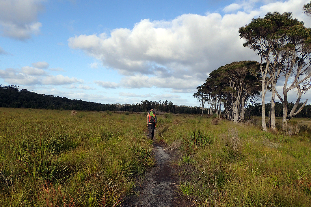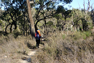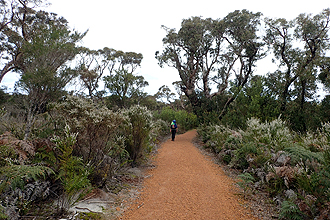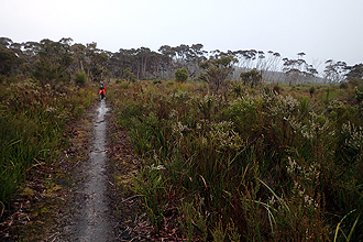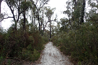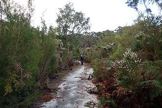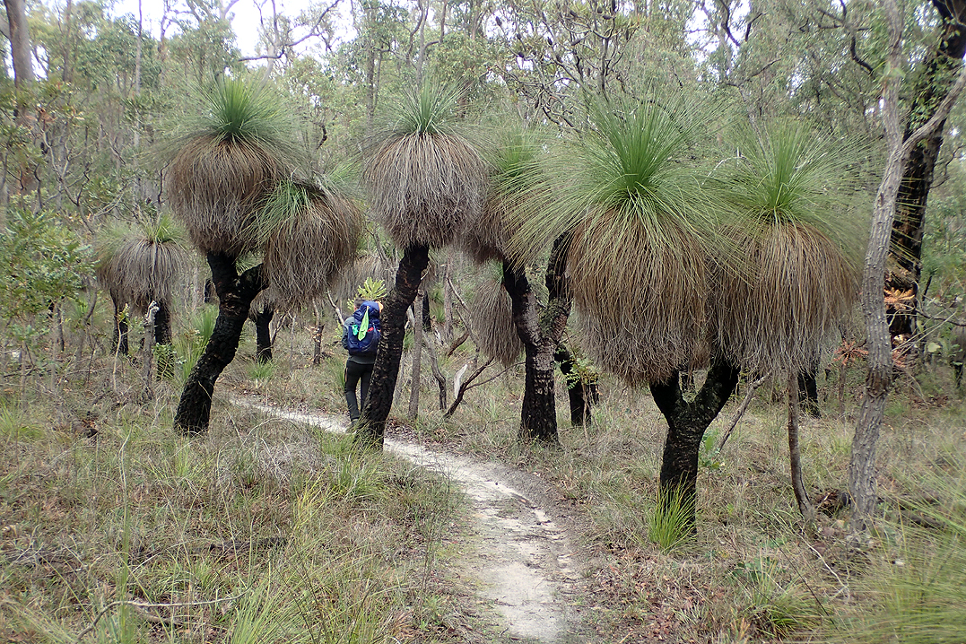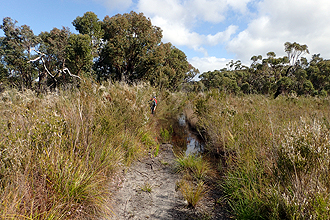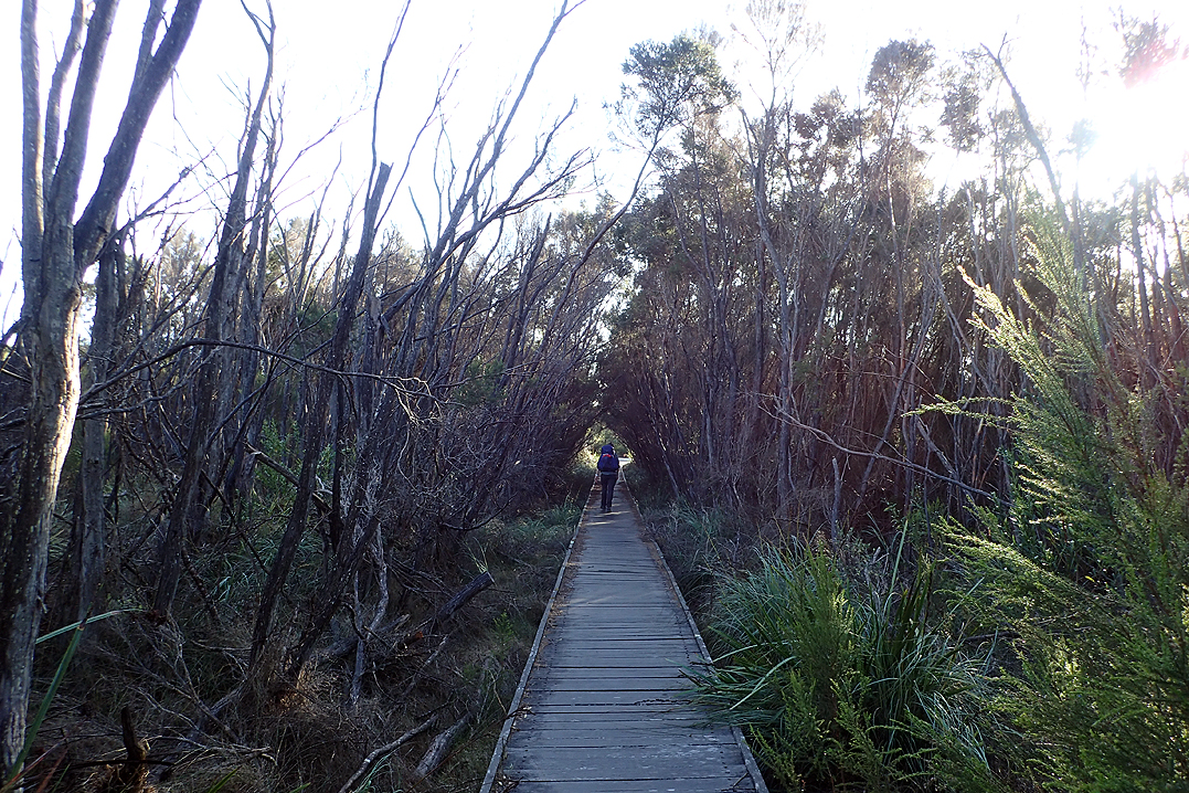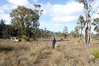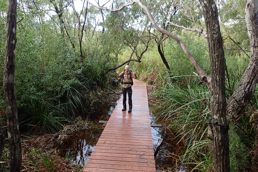 Today's walk introduced us to wading through puddles! The path was often inundated by multiple pools which were difficult to get around and deep enough to require the removal of boots, socks and pants. Luckily this entire section is across sandy plains so it is comfortable under foot, especially when you can’t see the bottom through whiskey-coloured water. The water was usually cold and the pools were full of tadpoles. The frog chorus is the sound of this section, it never leaves you, from the sentinel frog who waits by the path and emits a warning to the rest, to the sound of hundreds croaking together. Day and night. The track passes through the beautiful D'Entrecasteaux National Park.