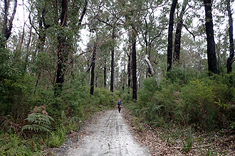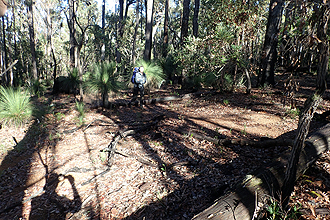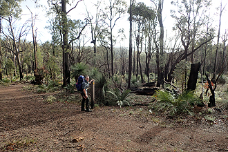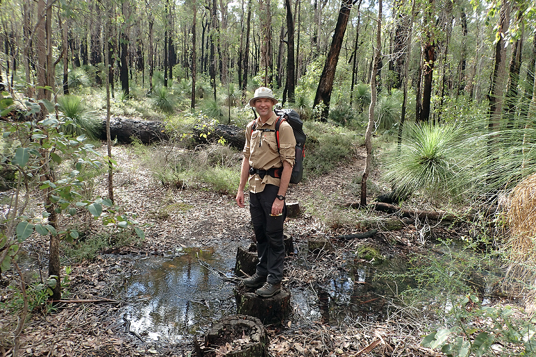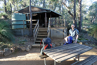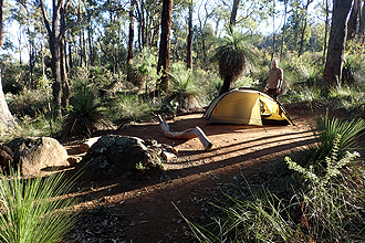 We woke early on Day 2 and made our way to Warren Hut where we found out that four people had spent the night. Two of these were end-to-enders. After passing through the hut area, we crossed the River Road Bridge, and then wound our way along the Warren River towards Moons Crossing. Nothing too exciting along this section of the track, but early morning in the Karri forest was beautiful. After a couple of rest stops along the way, and a couple more snake spottings, we arrived at the Schafer Hut in the afternoon and enjoyed a nice relaxing swim in the nearby dam. The water was cool, but ever so refreshing. This would have been an ideal place to spend the night, but with the following day being the last day of the long weekend, we wanted to miss the end of weekend traffic back to Perth so decided to push on. We had planned to spend the night near Lane-Poole Road, but it turned out that water was not going to be easy to find. We pushed on for a further 3 km until we crossed a small stream with water that could be filtered. We pitched the tent in the middle of the track and listened to the amazing birdlife while the sun went down. The total distance covered for the day was 28.0 km in 6h30 walking time.