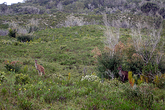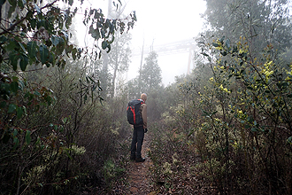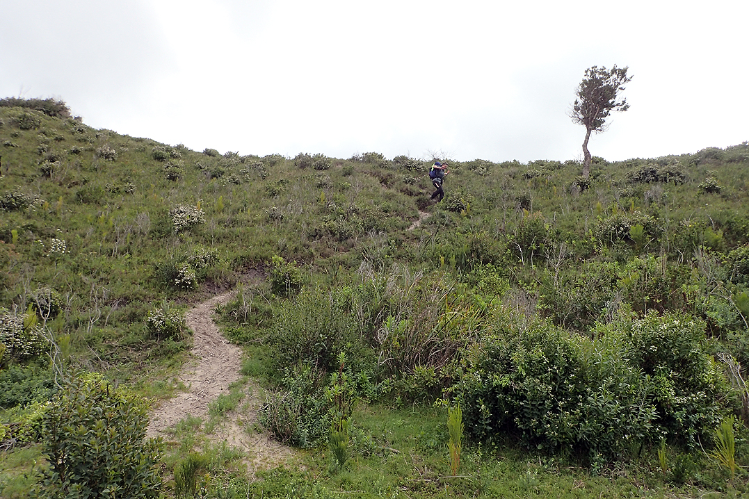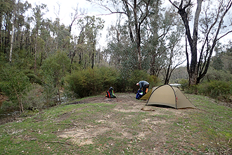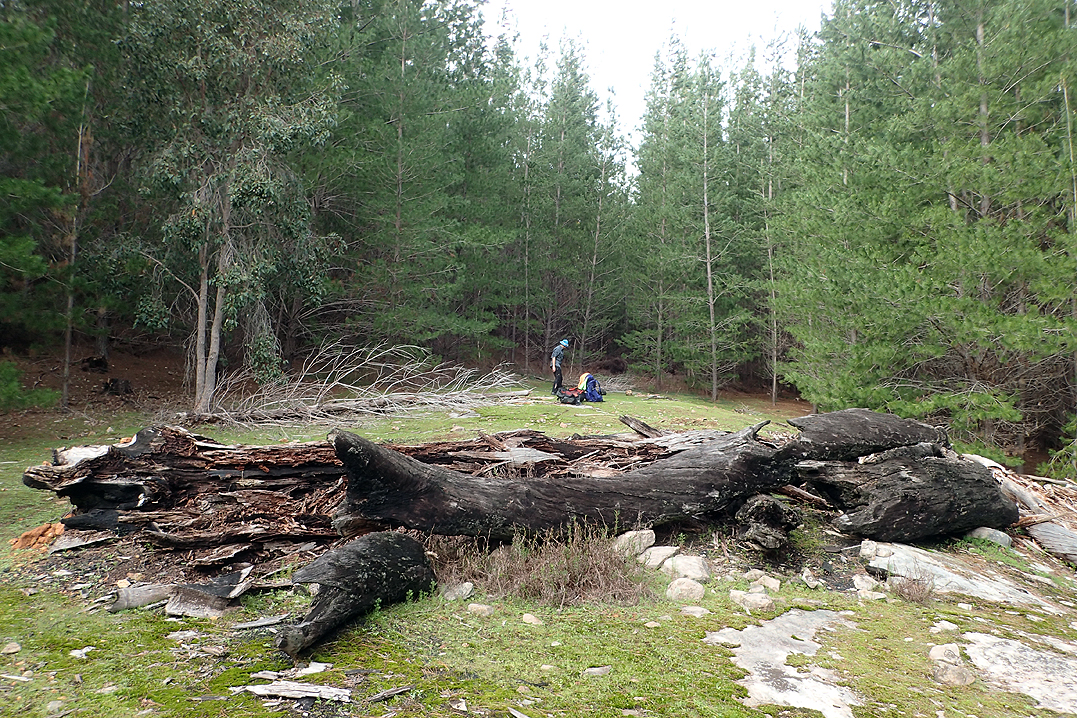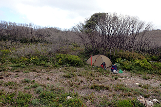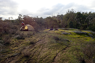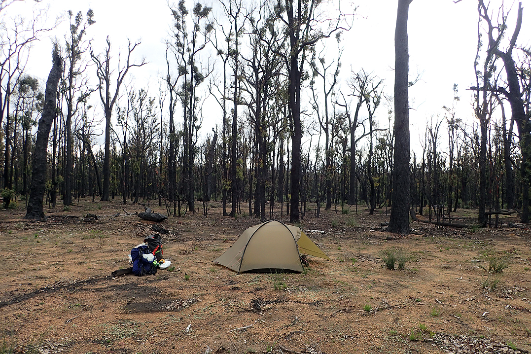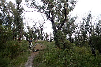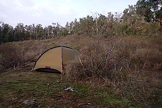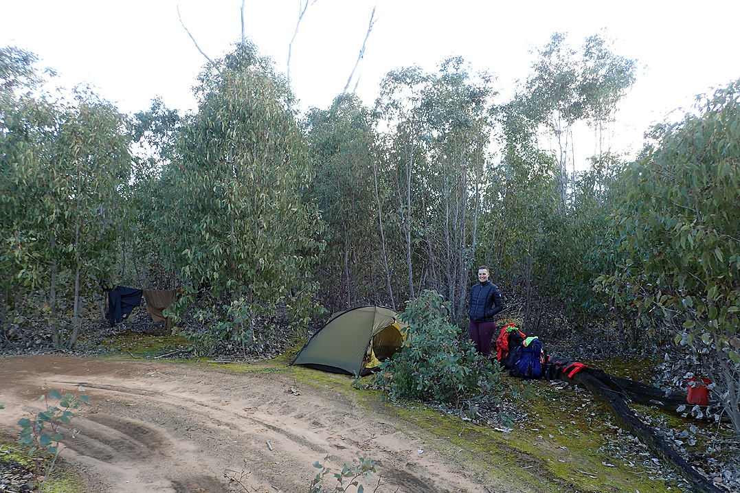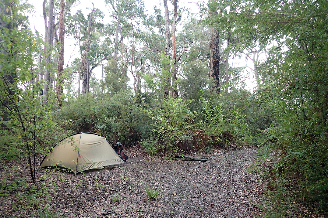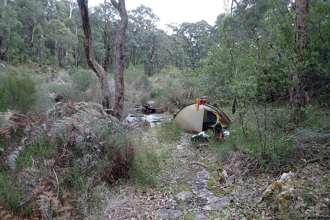 We were cold and wet, our feet were finished and there was the post-kangaroo trauma of course, when we hit an almost impossible uphill. We had almost given up hope of finding a campsite. Everywhere was so hemmed in with vegetation. Then all of a sudden the perfect, level and bare camp spot was just there, just off the trail. Mike was first on the scene and from a couple of hundred meters below him, I saw him drop his pack and smile. Highlight of the day! As we got the tent up and hopped in the hail started falling. So happy to call it a day.
