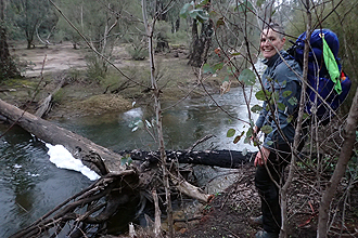 In trying to get around the deep pool of water that we were warned about (which was actually a river so a bridge might come in handy there) by clambering over reeds, I slipped and overtopped one boot so now that was full of water which is never a good feeling! I started feeling a bit depressed as I was dealing with the fungus foot anyway and now my feet were in water all day. How was this going to end? Nothing for it but to keep going. I was thinking that had we known the extent of this water I might have mailed water shoes to Northcliffe, but surely you can’t just have wet feet for 4 days? Can’t be comfortable. We went through all levels of "hacked off-ness". The thing was though, the Pingerup Plains were beautiful, there was no denying, and easy walking, the sky was blue and wet feet were not the end of the world. We struggled to maintain perspective as we approached Woolbales Hut and endured about 300m of water. Longest puddle in the history of our Bibbulmun. By now we had worked out how to tell the age of the puddles - if the tadpoles are growing legs, the puddles have been there a while!