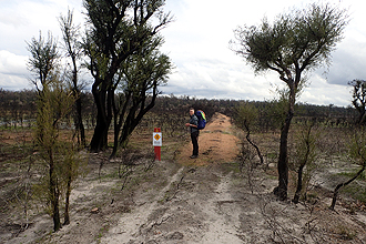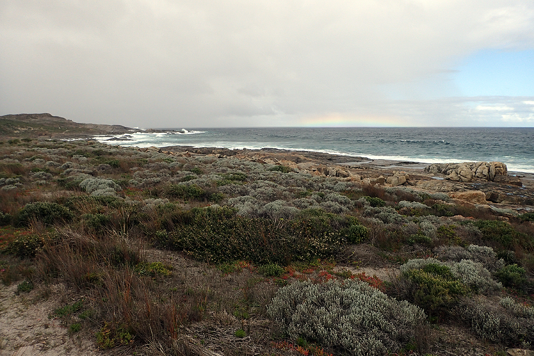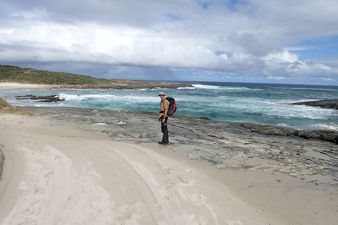 It was a big day for us as we would see the sea for the first time on the trip and we were pretty excited. There were still puddles, but John was right, it was much easier to get around them or through them. I started my day with my feet inside plastic packets and this worked to dry out my boots! Also, all those puddles actually cured my fungus foot completely. Must have been too cold. While all this was going on, Mike was using his leather boots like wellington’s and his feet remained dry. We said goodbye to the Pingerup Plains with their puddles, frogs, tadpoles, boronia-scented beauty and hit Mandalay Beach. Marvellous!