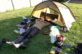 We ate, pitched the tent and about 2 hours later Mike woke up with a totally flat mattress. Puncture? He reinflated the mat and it was flat again by morning.