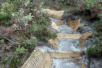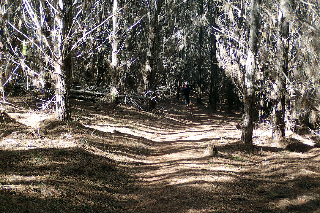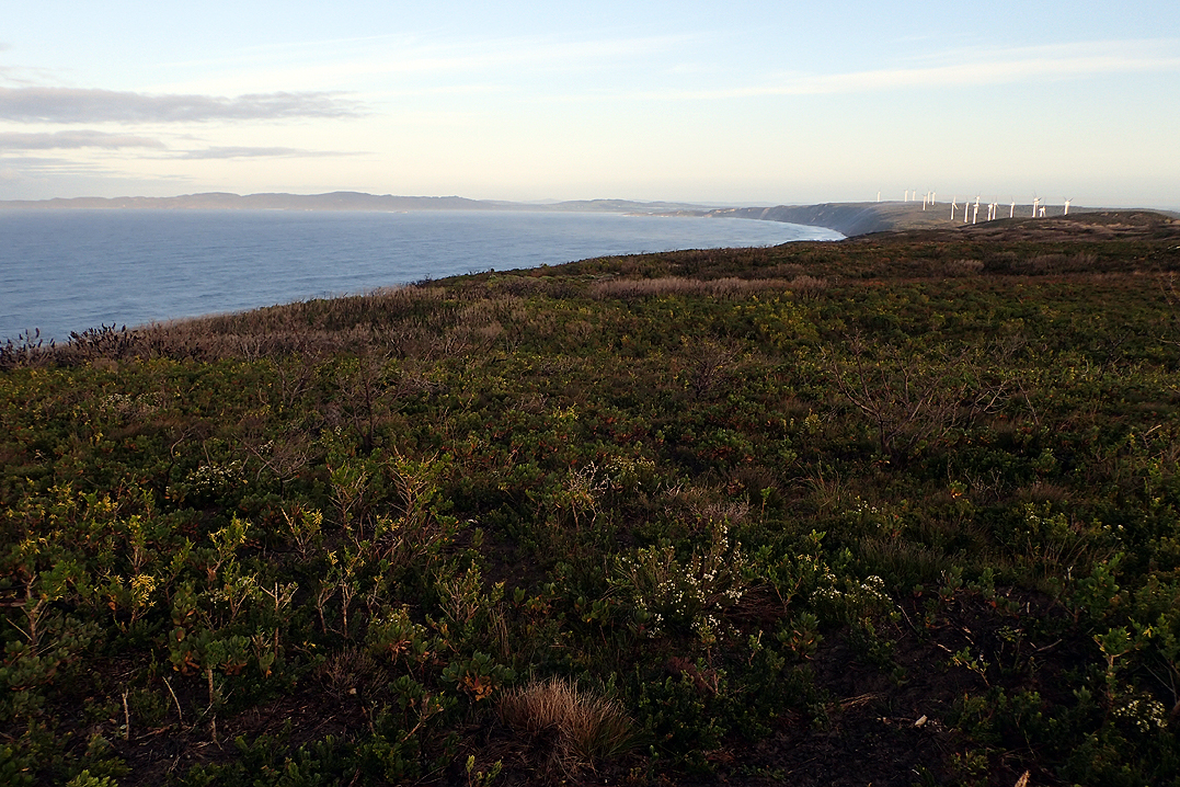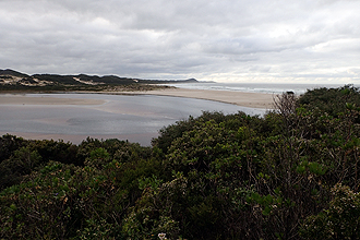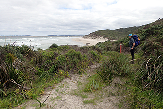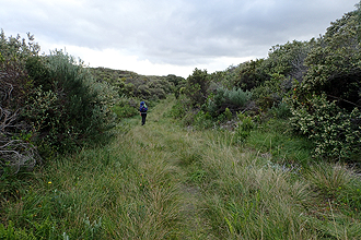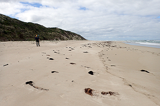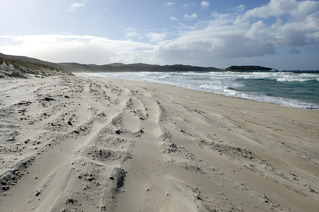 The trail wound backwards and forwards from coast to coastal plain. By lunchtime we had reached Parry Beach where there is a campsite. We walked along the beach for about 1km before crossing the inlet. These inlet crossings are always fiercely reported on in the log books. The descriptions will vary from waist deep to knee deep to head height. The water was flowing pretty strongly from the inlet into the sea but it was only just above knee height and about 10m across. After this crossing the beach sand turned very soft and walking was difficult all the way along Mazzoletti Beach for a further 7km. The sights and sound of the roaring waves made it enjoyable all the same.