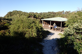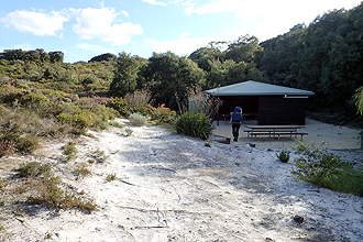 Then we had the relatively pointless climb up Mount Hallowell which went on forever and had almost no view from the top. You could see part of the Wilson Inlet opening. The sandbar which makes the inlet crossable on foot for much of the year had been breached a couple of weeks earlier. Walking the sandbar is not the official track but allows you to get to Nullaki Peninsula without breaking the trail. When the Bib was first planned there was supposed to be a boat that would take you across, but this no longer operates. Most hikers you meet (wait for it) GET IN A TAXI and get driven around the inlet. Some even (wait for it) arrange for accomodation in Denmark and the place they stay at drives them almost RIGHT up to the Nullaki Hut. I know what you are thinking, "If you are already walking nearly 1000km what is a few kilometers more?". We do not understand either.