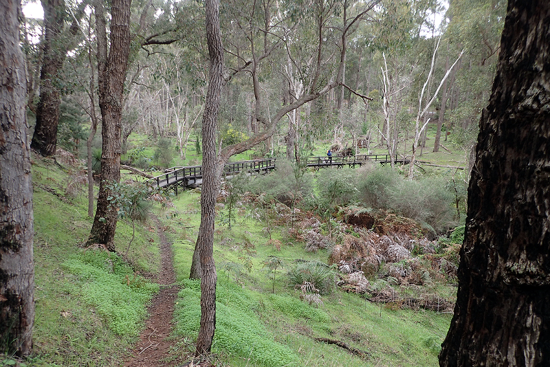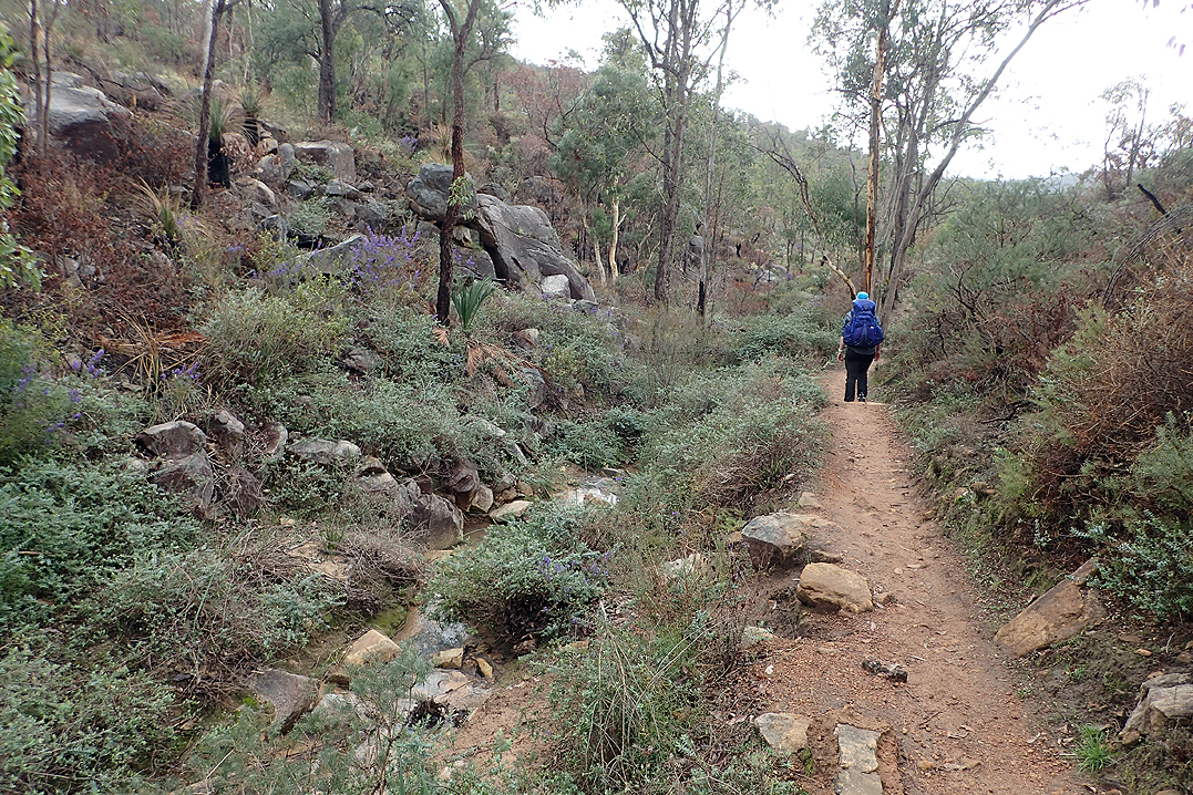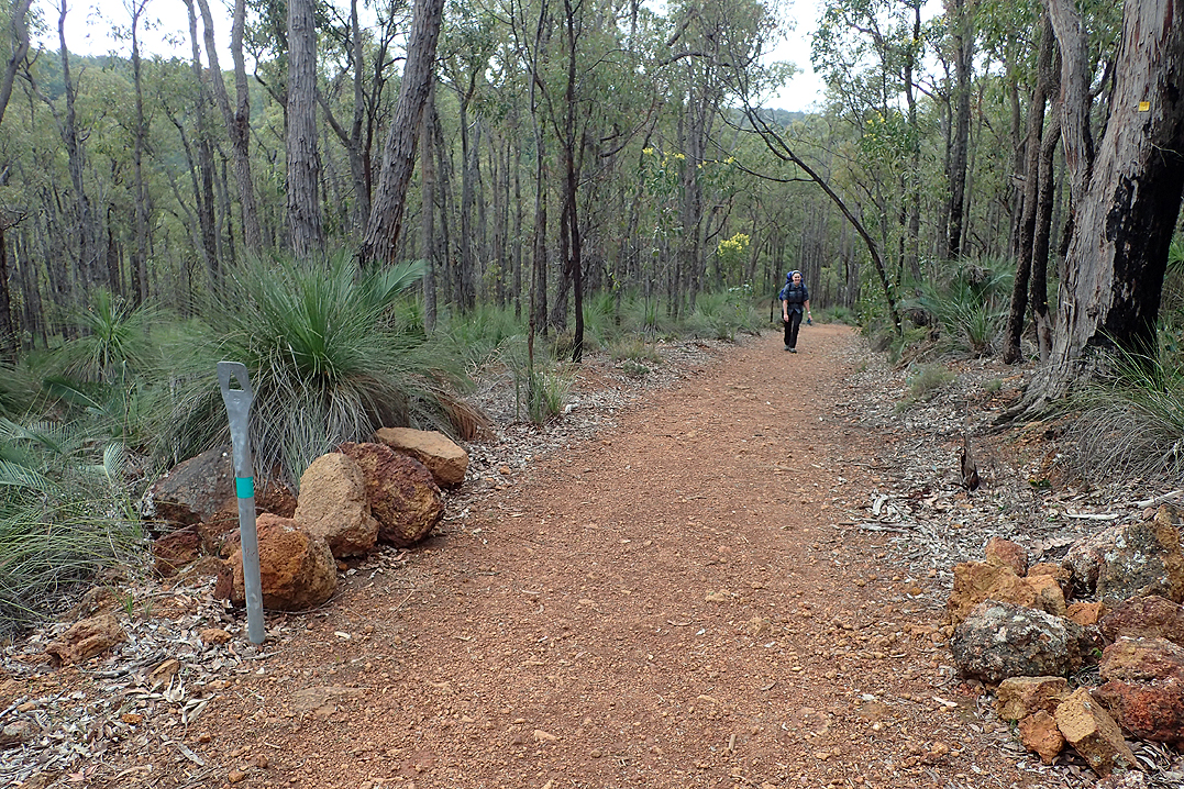 We caught the bus from home to Kalamunda and it was a 2 min walk from the Kalamunda Terminus to the start of the trail. It was a busy, warm Saturday. The trail leads sharply downhill from the start and is fairly rocky and twisty. We were surprised to see little rivers flowing and wild flowers. Our packs were heavy but manageable, but we were disappointed to miss a turn off and add on an extra 1.5 km to the day! Pretty soon we had crossed Mundaring Weir and passed the Hills Discovery Centre. We met a Bibb Vollie (volunteer) who advised us to take a rest day at Dwellingup but not at Collie as most people who have a day off at Collie bail! At this point we had only Dwellingup on our minds anyway as our first goal.