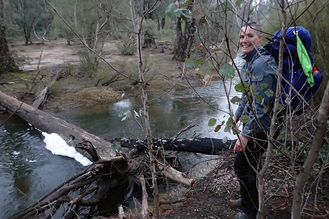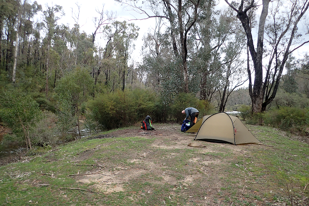 This section is dominated by the Murray River which we hoped would offer up river swims. It did, but the abundance of water also meant quite bushy, overgrown pathways where you felt hemmed in by creepers and over ambitious thorn bushes. We like open spaces so this was not a favourite section for us. We had our main meal at lunchtime at Murray Hut and kept going, seeking out the perfect camp spot along the river bank. This took longer than expected until eventually it was inching towards 17:00 (sunset was 17:30) when we spotted a good option. It entailed some bushbashing to get to the river and then climbing along a huge fallen tree which spanned part of the river. This deposited you on an island where you could camp. It was a great spot. Mike offered to walk both backpacks across, which was a good thing as I slipped on my arse in the mud before even getting to the log. My behind was CAKED in it. Washed the area in the river so I had partially wet pants to look forward to first thing the next day. Now we only had to hope for no rain overnight, camping in a floodplain always makes that one’s most fervent wish!