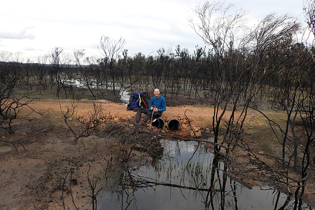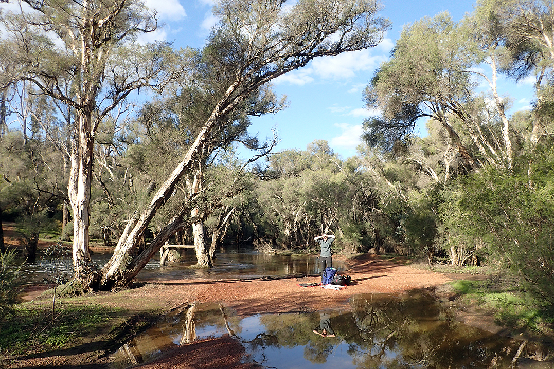 At the turn off to the Lake the diversion route marker along an unsealed road was uncovered so we were not sure what that meant. Were we supposed to take the diversion? Or could we still reach the hut? We were thinking that the route to the lake could be flooded. We are worried about this section as on our map there were no warnings about seasonal inundations as there were further on through this section. We had met people who told us scary stories about the crossing of the Pingerup Plains. Usually they entailed phrases such as "waist deep water" or "chest deep water". At which point the bloke telling you this would hold his hands along a line about chest height for emphasis. We decided to follow the route as normal and hoped for the best. It was fine and the hut by the lake as well as the lake were beautiful. I arrived with my pants off as somewhere during the day I had grown tired of putting my pants, socks and boots back on after wading so I just left my pants off.