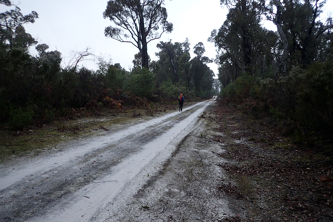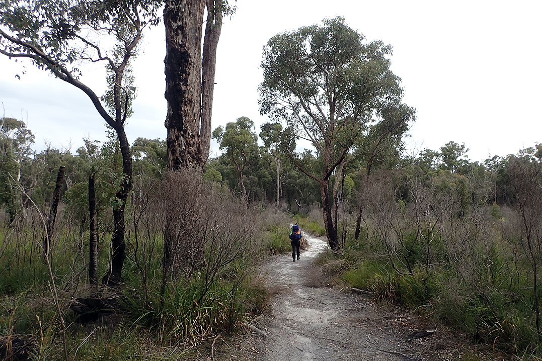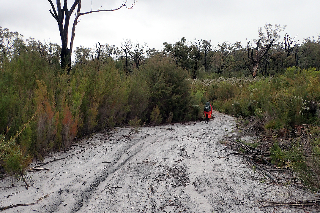 This part of the walk is back in the trees, and to be truthful we had had enough of that. We were keen to get back to the coast. We lunched at Giant’s Hut and then kept going really to a point where we were on the sandy coastal plain again. We pushed the weather as far as we could and got the tent up just as the rain came in.