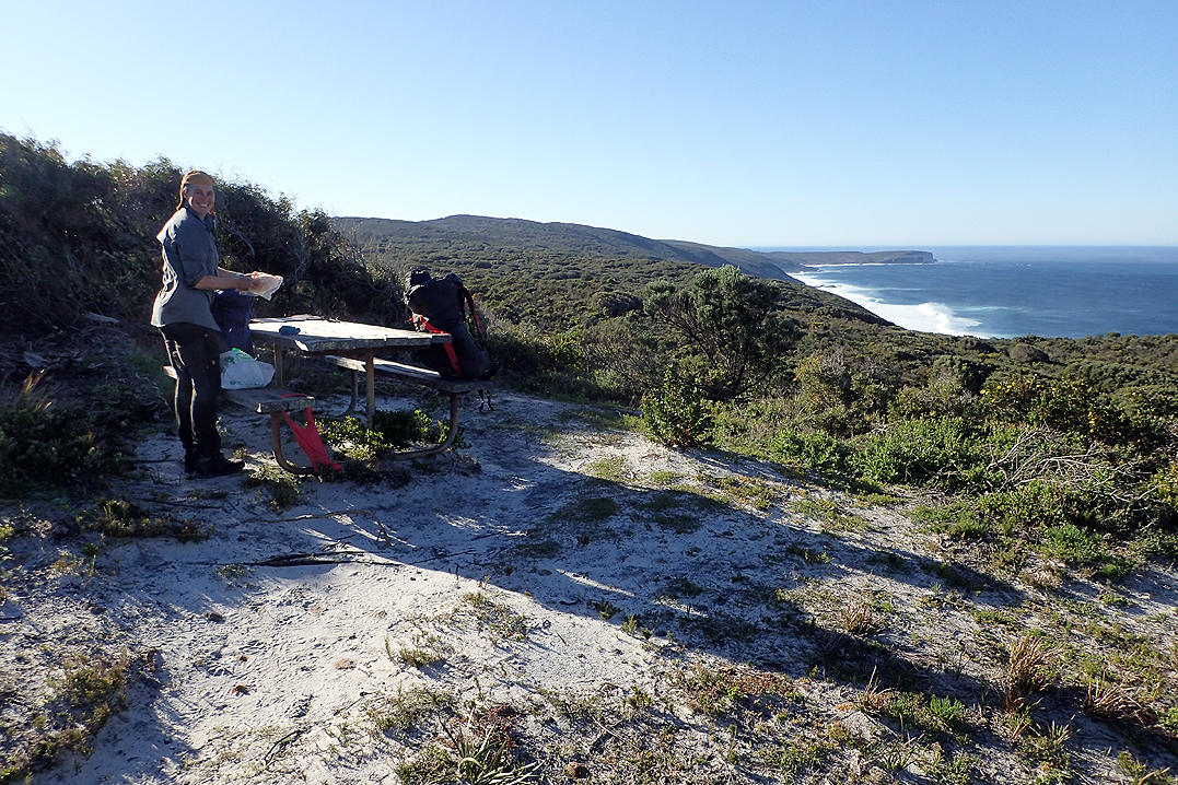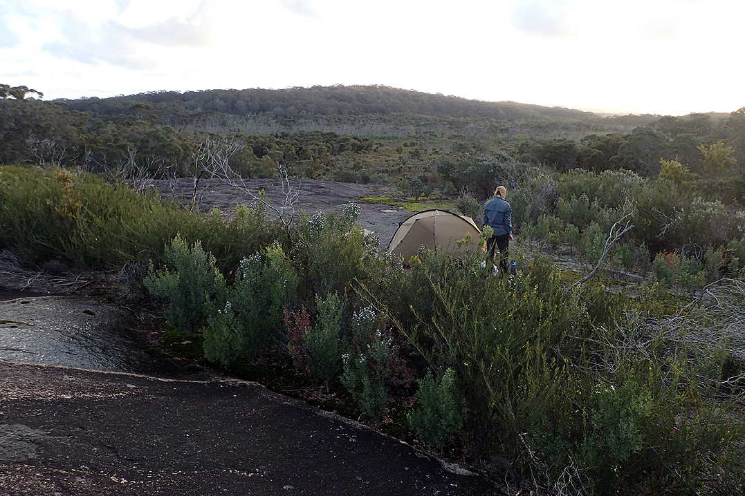 You leave the beach with the help of a rope that allows you to scale the vertical sand dune! William Bay Hut was another wonderful hut with great ocean views from a massive, flat-topped boulder. We were tempted to pitch our tent on it! We sat up there and watched the sunset and the sunrise the next day. It is a great spot. My mattress has been deflating overnight. We found another small hole next to the first and patched it.