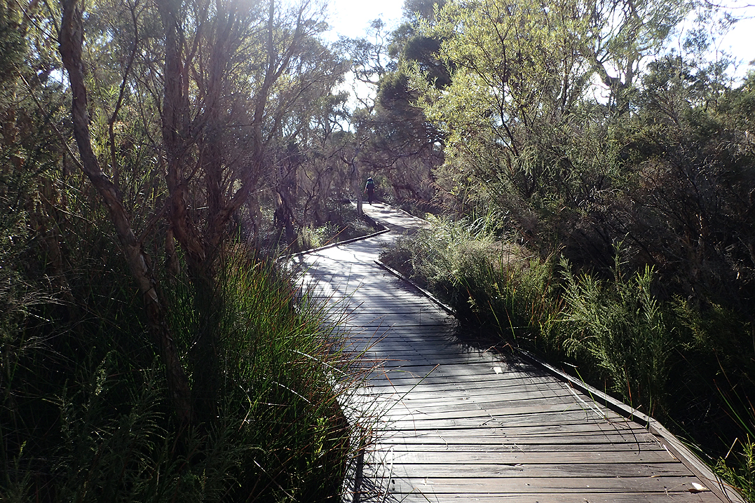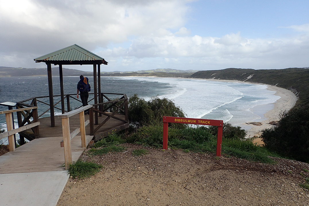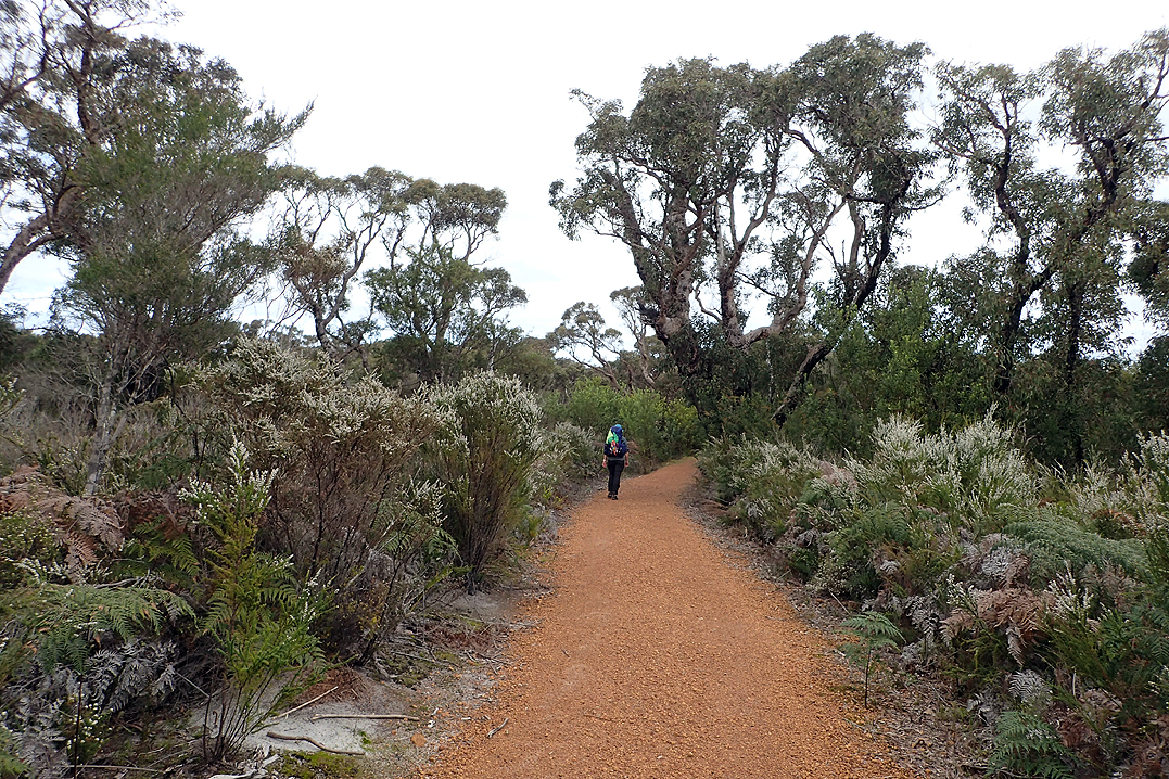 It was a short 10km walk into Walpole and passed through Tingle forest and passed good view points. The last bit was over a boardwalk and after crossing the river you emerge into the picnic areas that run along the main street. We were very impressed with Walpole. We probably liked it more than any other track town. It had a good feel about it and when walking through the suburbs the houses were all really neat and well presented. There does not seem to be much new development which the bigger towns had and was not always well done. We had run low on supplies from Northcliffe-Walpole and had started to fantasize about all we would buy and eat when we got there! The supermarket was brilliant and we did indeed buy a lot of food and eat a lot of food! We sat in the sun at the visitor’s centre at a table and benches and stayed about three hours. Whenever we are sitting in the sun long enough we would whip out the solar panel and charge the phone, camera and the Kindles. We also looked at the route to come and worked out how much longer we had to go. We had already revised our trip length from 49 to 46 days. Now we realised we would complete it in 43 days (including one rest day). We decided to book our flights home from Albany to Perth and after that we realised it was all locked in and there wasn’t long to go.
