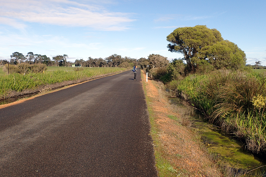 We had route options on the day as you could actually abandon the trail completely and use unsealed roads which would not add on distance. The track and roads run parallel but the roads are not subjected to the same levels of inundation as the track. There was a section where we chose the road, but the track is so beautiful here and the scenery of the Pingerup Plains is exquisite, so we put up with the wading. We were still stopping a lot to take our boots off which is a pain as you have to dry your feet properly afterwards and get all the sand off before putting your boots on. It is very time consuming. We were also becoming a bit more gung ho and where possible just legging it boots and all where the puddles seemed shallower. Walking the puddles barefoot could result in very cold feet, especially if they went off for a few 100m or there were multiple puddles.
