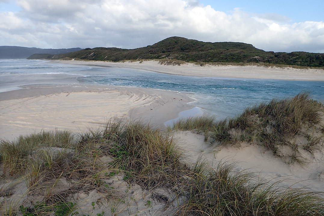We arrived at the beach into a gale force wind which whipped the incoming tide into a frenzy. There was barely any beach to walk on. Luckily we could climb up onto a vehicle track. As we approached the inlet we readied ourselves. We had wondered if we might float our packs across, so we had made sure everything was waterproofed and sealed up. Luckily with only one day to go our packs were light and we had little food remaining. We stripped down to our swimmers and decided our best bet was right where the ocean was rushing into the inlet. Mike took a walk in and the water barely reached his knees! Winner! We grabbed our packs, slung them on our backs and easy peasy we were done! Mike made a double fist pump! What a beat up! All that stress. We were so happy, we dressed right away in the dunes and sat down for brekky. We felt we could now enjoy the rest of the walk.