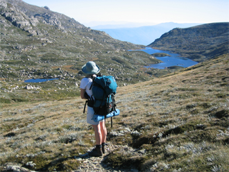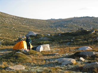 Woke up the next morning to a glorious day, and after packing up, we headed off towards Carruthers Peak, passing Albina Lake, and Club Lake, along the way. After having a break at the top, we headed off down towards Blue Lake, and instead of following the concrete pathway down the hill to the Snowy River, we took the bundu-bash route following Blue Lake Creek past Hedley Tarn. Although a lot harder, it made it more worthwhile as walking along a concrete path in these sorts of surroundings just seems plain wrong. We walked a little way up Club Lake Creek, one of the smallish tributaries to the Snowy River, and set up camp for the night.