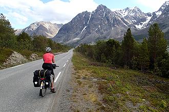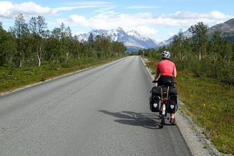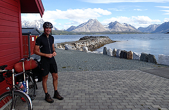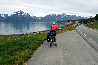 We left without breakfast as there was a shop about 18 km down the road but this was not open by the time we passed at 8:00 am having made an early start. Shortly after this we had a long, quite tough climb which rewarded us in wonderful views of the fjords below as the route rose above the treeline. This was followed by a wonderful descent and then some coastal riding before the next climb which was as hard, but shorter. On the way down the other side we passed a man coming up the hill in a wheelchair type machine but instead of wheeling he was using ski poles to propel himself forwards, or rather upwards. Seeing something like this is to marvel at the effort and realise that two useful legs can take you anywhere if he can wheel himself there too. We then descended into Burfjord where we shopped for food and had lunch. We also made use of the free wifi at the visitor's centre which was a great little place, very friendly and relaxed with a large lavuu outside. We were treated to two flyovers by fighter jets flying very low and deafening us! After this we entered Finnmark which was pretty exciting as this is the real deal; 70 degrees north and mozzies the size of helicopters. We were on the lookout for a suitable campspot from here and turned off the E6 onto a secondary road to cross a river thinking we would find a good spot, which we did. It is in the open along a big river where we had a great swim.
