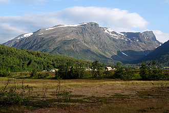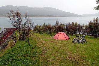 We checked out of the hotel in brilliant sunshine at 12:00 pm and had a fantastic ride. We headed to Breivikeidet, about 50 km away to catch the ferry to Svensby and then from there another 20 km or so to Lungseidet to catch a ferry to Olderdalen. The first leg was along a flat, quiet road that rolled along between fabulous snowcapped mountains with waterfalls running from top to bottom and birch forest. It was a very different ride to any we had had in Norway thus far, more like Finland really if you ignored the spectacular mountain scenery. The next leg was along a fjord with steep scree slopes from the surrounding mountains rushing down to water's edge. We were amazed that this was not also given National Tourist Route status as it was some of the most dramatic scenery we had seen. Not complaining though, as it meant fewer campervans for us. We shopped in Lyngseidet and waited for the ferry in the glorious sunshine, staring into the clear depths of the harbour before us. Arriving in Olderdalen at 6:30 pm we noticed that the place names are now in Norwegian and Sámi and started looking for a bush camp. We found a place a few kilometres down the road where there was access to a river for a swim and also a place to pitch the tent. It looked as if it had once been a sort of holiday cabin place as there were a few numbered wooden cabins in disrepair and a "kioski" building also old and rundown. We pitched the tent quick smart as we were being attacked from all sides by mozzies and horseflies, then rushed down to the river for a quick in and out swim, and then back to the tent before the mozzies caught up. Once in our tent we are safe and feel at home! Looking at the map it was amazing to see how close we are to Finland from here.