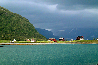 We had no rain overnight and none all day but the weather was really strange, almost as if a summer thunderstorm was about to hit but never did. We had a headwind for the first 20 km as we made up our shortfall from yesterday and then after this the wind was not much of a problem. Alot of the time the waters of the fjords we rode alongside were dead still and the sky was often very dark grey and always overcast. But no rain.