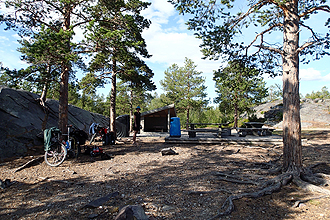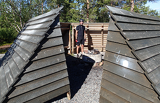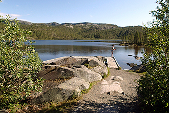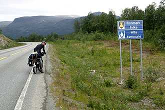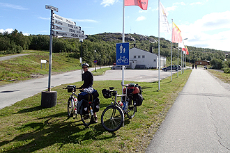 Before arriving in the town, we passed the UNESCO World Heritage Site: rock carvings in the area. You could see the preserved carvings laid out far below. We shopped for food in Alta as we were heading for a bush camp just after it. It always takes a little getting used to for us when in Europe, but cyclists are given right of way in most cases by motorists. You get used to it after a while and whilst you never really expect it you anticipate it. Well, the folk of Alta differ in this respect. Within 300 m I was nearly run over twice and yelled at by another cyclist when I wandered into his path. After being used to Norwegians who are generally seen but not heard, this was a surprise. Perhaps it's the midnight sun. Anyway, we didn't stick around and got on with getting to our campsite. This was an area we had spotted on the map which included a swimming hole, lean-to and toilet. It entailed a steep climb and then some riding over rough track but when we arrived it was perfect. A lovely picnic area, toilet, rubbish bins and benches. The lake had an excellent swimming hole with boardwalk and an area demarcated for camping. What more could we ask for? Oh yes, the bugs were manageable also. We had a couple of swims and ate at the benches. Mike even did some bike maintenance as my bike had developed an irritating clicking sound that we can't get rid of. Then it was into the tent by 7:00 pm. We have about 230 km to go to Nordkapp and then it's southwards again.