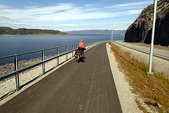 A beautiful day! Sunny but not too hot, perfect for cycling. We had wonderful views of the surrounding mountains. Finnmark does not have many towns and we passed two today, Talvik after 40 km and then the large town of Alta at around 80 km. We had a great ride, passing another Sámi souvenier gallery at the top of the climb before Talvik. The road was undulating and hugged the fjords. There were two sections undergoing road imporvements which was a bit tiresome and we saw another tunnel under construction. We had a detour to avoid another tunnel that took us up a climb but the views were so good that it was worth it. We stopped at a lake for lunch and coffee. The mozzies and other nibblers are being kept under control by a cocktail of sprays. Shortly after this rest stop we had a cycleway that took us right through Alta. The road had been upgraded at some point and this fabulous cycleway was added.
