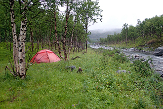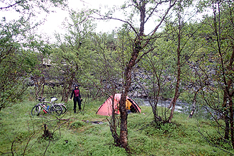 It was a flat ride along the coast until we got to the Coop, which was small but had all we needed. Interestingly it was open on Sundays too (it was Saturday today). One can never tell! We had to stock up for Sunday anyway. We sat outside and ate breakfast and another cycle tourist rode past, on his way to Nordkapp from the looks of things. We haven't really seen tourists since reaching Tromsoø. Straight after this we started the climb. The rain came and went and of course climbing is always hot work, wearing rain gear does not help! Once at the top we met with a large, rushing river and started looking for a camp spot. We weren't keen to wait 'til the lake as if there was vehicle access, campervans could access the spots too. We stopped a few times and then came across a small clearing just over a rise, closish to the road and with good river access. This is always the hard part but the swim is best done right away! We pitched the tent and got in. It did not feel as cold as we had expected, possibly as we were cold ourselves! We got dry and into the tent. It was only 1:00 pm so we still had the whole day to rest and boy did we sleep! I couldn't believe it. Obviously we needed it. It rained all afternoon and we were pleased that we had moved on and got a small climb over with but also that we had stopped early. We are actually ahead of schedule which is a good position. We really hope the weather improves tomorrow.