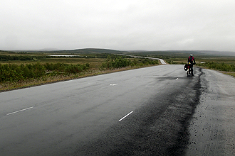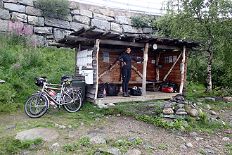 Unfortunately, something about the Greek meatball and potato salad meal for dinner didn't agree with Mike and he struggled with nausea overnight, culminating in a puke session in the early hours of the morning: Yummy! Hereafter he was able to fall asleep but rain began to fall around 4:00 am and neither of us could get out of bed and were still falling in and out of sleep fantasising about a rest day. It was a goodish spot for one, but a group of teenages with motorbikes had created some disturbance last night and also left a bit of a mess around the picnic area so we were reluctant to stay. Also, we needed food and that entailed a 4 km ride down and then up the steep hill again so our time was better served moving on. We had a look at the map and saw that we had a 250 m climb up to the Alta plateau where there was a lake. It was only a 22 km ride and we would pass a shop at Rafsbotn. We had discounted the shop previously as thought we would pass it too early but as we ended up breaking camp only at 10:00 am, this was no longer an issue! So we had a late start and set off in the rain. We still can't believe the weather in Norway. It seems that one good day is all that can be achieved and then the rain moves in. Who would have thought that we were lounging on the boardwalk yesterday in our swimmers in the sun?