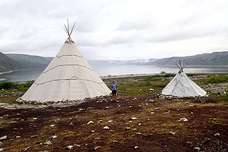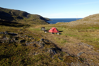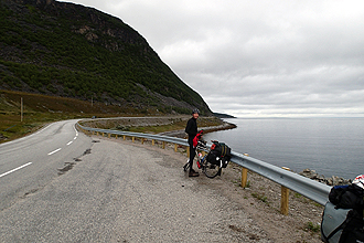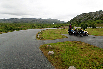 We would recommend this route 100% to anyone travelling by any means in Norway. The road to Nordkapp has it's special attraction of course, but the scenery here was remarkable. We left Kjøllefjord and after the first climb, met the road from Mehamn. We descended into Hopseidet and thereafter climbed up to 346 m above sea level on the Nordkynveg. We descended to the coast again and then the road undulated until Lebesby and onwards to Ifjord. We thought we would find a camp spot along the river at Ifjord, or further on at a lake, but it was not to be. We had no choice but to commence the third climb, on top of which we found a great river which we could camp beside. The day turned out much longer that we had planned because of the camp spot hunt! Other things that happened of interest: on the first climb Mike was approached by a Finnish man in a car who pulled up alongside him and asked to borrow a spanner as his tow bar connection was coming loose! Mike said "Can't stop right now" but flagged him down when the climb eased off and we were able to help with the spanner he needed. Then just before the end of the day passing through a reindeer herding settlement, a husky dog ran out at us wanting to attack me. Mike fended him off. The road that we travelled was completey off the tourist route and very quiet. We loved it! We have only three days left cycling in Norway before we enter Finland.
