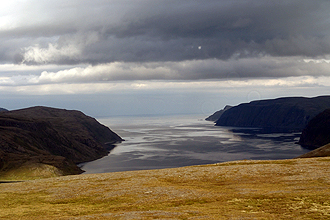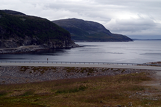 The rain stopped overnight which was promising but started up again just as we prepared to leave and we rode in it all day. Soaking wet! We had a longish climb up to the Finnmark Plateau proper and it was beautiful up there. Some groups of huts, probably reindeer herders, and flat openness all around. We passed a large herd of reindeer as they hung about on the road or crossed it to go up the hill or down to the river. The locals in cars just drop their speed slightly and hoot to frighten them off but they are curious of us on bikes. There were a few high points but nothing over 385 m and then we started to drop down slightly. The views were good, but plenty of cloud cover obscured things. We reached Skaidi and amazingly there was a small open grocery store where we bought a couple of things and they helpfully filled up our water bottles too. From Skaidi it was 22 km to Olderfjord but we would camp short of that along a river where it looked as if we would find a good bush camp. The rain had stopped by now but it was very overcast and we were cold. We stopped to check a few possible camping spots. The advantage of the cold (10 degrees max today) was that the mozzies and their friends kept away. With only 400 m remaining where the river ran close to the road we found a wonderful camp spot right on the river with paths down to it. It was perfect and just in time! The river swim seemed a bit of an effort but we had to do it and then climbed into all our warm gear aned sleeping bags to thaw out. Tomorrow night we will get to the Nordkapp tunnel where we will camp in order to tackle it first thing in the morning when the traffic is at the minimum.