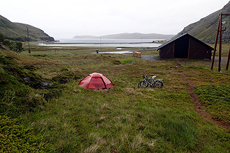 Kjøllefjord is a very remote community and the surrounding hills were barren and beautiful. We only rode a few kilometres before arriving at a suitable camp spot beside a small river, and along a winter snowmobile track. The snowmobile graveyard and street lights dotting the hillside were the give away. We braved a river swim beseiged by bugs and then jumped in the tent.