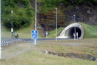 With about 30 km to go we stopped for our flasks of coffee as the first drops of rain began to fall. We put on our wet weather gear and got back into it. The road ceased it's flat weaving in and out and became slightly hillier as it climbed away from the coast a bit at times. Here there are no trees, only low lying groundcovers, berry bushes, lichen and moss. Reindeer in groups on the road here and there. Now we made our aquaintance with the wind which became a really strong Westerly. We had headwinds and crosswinds for the last 30 km. It was hard work and the needling rain didn't help! We rounded the bend of Kalfjord and reached the famous Nordkapp Tunnel. It announced itself with signs "Fog in tunnel" and "9% gradient, vehicles engage low gear". We stopped right at the mouth and camped in the open ground to the left of it. There are steep mountains and a big waterfall behind us. Again, the idea of the end of day river swim seemed less attractive but we managed it and then warmed up. The road was not that busy today, perhaps due to the weather tourists are not flocking to Nordkapp, but even so our plan is to be the first one's into the tunnel in the morning!