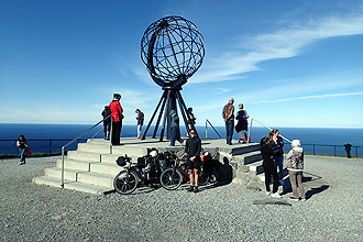 The road to Nordkapp from Honningsvåg is quite tough, steep climbs and descents. Also it is one of the most beautiful roads we have ridden. It sweeps up and down before you, dipping up and down towards the plateau. What a perfect day for it! If there was a day we had wished for good weather, this was it. It made up for all the rain days we have had. The banana had apparently worked wonders and onwards we went. The road kept climbing and descending and then you could see all the vehicles parked and the cluster of buildings that is Nordkapp. A motorcycle tourist passed us and slowed down to say "I admire what you do!". Wasn't that nice? We pulled up to the entrance gate and were told "Cyclists are free" as we expected. The views were magnificent and actually reminded us of Cape Point in Cape Town, except for the herds of raindeer. The sea was calm and the sky was blue. The visitor's centre is big and has seating attached to the eateries but outside there was nowhere to sit out of the wind, so we hunkered down against a wall and relaxed. Ate a bit. The place had a really nice atmoshpere. One man asked if he could have a photo taken with my bike! We also met a Swedish cycle tourist who had just finished his trip from Spain to Nordkapp in 10 weeks! We ended up leaving at about 4:30 pm and found a great bush camp not far down the road where we still have views of the sea. It was a wonderful day. Total ascent for the day amounted to 1,277 m!