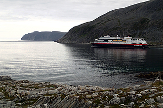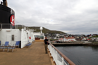 We stopped at the Rema once again to stock up, Mike feeling much better now than he had yesterday! We then headed to the ferry terminal. We ate breakfast and used the free wifi at the info office to upload the website. The Hurtigruten announced it's arrival at 11:30 am with a loud hoot and we could then get on and purchase our tickets. It worked out well as this stop is for three hours, allowing those on board time to go by bus to Nordkapp which most do, being a highlight of the trip. So we were able to get on board before 12 noon, the boat left at 3:00 pm and we disembarked at Kjøllefjord at 5:00 pm. The Hurtigruten is the fleet of ships which travel from Bergen to Kirkenes along the coast, making 25 stops in the course of a week. Many people do it as one complete voyage as it is such a great way to see the coast of Norway, but you can get on and off anywhere along the route. It is very expensive to overnight or eat on board, and is considered a luxury vessel. It has great lounges and viewing decks and didn't seem at all crowded. For us it meant avoiding retracing our tyre tracks through the Nordkapp Tunnel and back along the coast for many kilometres and also gives us the opportunity to see the last Norwegian outpost of Kirkenes. As we will travel south through Eastern Finland this makes for time better spent. We should reach Kirkenes in 4 days and it is also a highlight being so close to the Russian border.