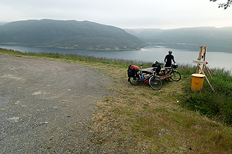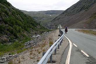 The cloud was low over the hills as we set off, but the road was quiet and beautiful. There was a bit of a strong headwind, but it soon disappeared. As it turned out, we had not finished the climb yesterday, we still had to climb another 120 m to a height of 370 m from our campsite. We saw very large herds of reindeer along the way, much larger than any on the Alta Plateau or on the road to Nordkapp. It is great to be off the tourist route. The descent proved interesting as when it started, visability was about 40 m. You could just see the white line sweeping away and all around only mist. The chevrons placed at regular intervals warned of tight bends, there were no barriers between us and a sheer drop. Then the bitument ended and we were on gravel due to road works which continued for a few 5 kilometers. By the time we had descended through that, we were well out of the cloud which was a relief. We also realised why the road was being resurfaced as the now original bitumen surface was very patched and bumpy; not up to the usual Norwegian standard at all!