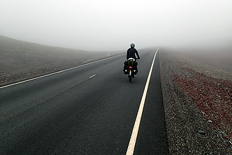 So the weather turned a bit adventurous during that first night camping at the Tunnel. The winds were extremely high and very loud as they came rushing down the slopes behind us, slamming into my side of the tent all night long. We could barely sleep due to the noise. At about 1:00 am we had a chat about it. Clearly the weather might be very bad and if that was the case we would not enjoy either the ride to Nordkapp or the views. Remembering what the silversmith had told us about wind yesterday, we were also worried about a bridge just after the Tunnel that could be dangerous to cross. It would be pointless to just get a few kilometres further down the road when we were in a pretty good position here; at a river so access to water, and a good place to camp. We had an extra meal as well so food should be okay, if a little lean! We checked the weather forecast online and saw that the weather would be shocking all day, but sunshine the next! Decision made, we would sit out the weather for the day and get to Nordkapp the following day. The rain started at about 2:00 am and it rained all day. The clouds rolled down the mountains onto us and we were in the damp drizzle when the rain eased. We lay in the tent and read, and listened to music, and now and then checked the road. We saw 5 cycle tourists make their brave entry into the scary Tunnel. Two of them women who squatted down for a quick wee beforehand. Thinking about the Tunnel makes me want to wee too! Late in the afternoon a group of 7 men stopped and got out their cars, one with a long coil of rope and hiked off up the very wet mountainside, right over the top. They came back an hour later. The things that go on in the Arctic!