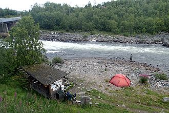 We ended up putting up the tent at 9:30 pm after the last fisherman had left. We had a terrific night's sleep with the roar of the river to lull us! We planned a leisurely start but woke around 6:30 am. One of the Finnish fishermen who was fishing last night was already back in his gear and on the bank. He was a friendly chap. I went up across the bridge to use the toilet at the car park and saw a large herd of reindeer swimming across the river just above the rapids. Not sure why they don't use the bridge! It was an amazing sight. One adult and two young one's got swept down the rapids but two made their way to shore from there; must be strong swimmers. One of the babies was swept downstream and I watched from the bridge as he made a huge effort to get out of the strong flow of the water. He managed to haul himself out at a flat rock near the fisherman and Mike at the shelter below. The fisherman called out to Mike and they watched as the little thing just stood there shivering and bleating. I went on to the toilet and when I got back to the campsite I saw the baby reindeer trying to get across the road. How it made it's way back to the herd I don't know.