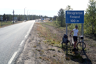 We picked up a simple bike computer at Intersport just out of town. The road was much quieter than it had been on Monday morning, less truck traffic. Also it seemed easier. Clearly a bit of pampering in a hotel i.e. comfy bed and shower, make a difference to performance! We had a rest after about 30 km and then passed the fishing spot where we turned left immediately towards Finland. The border crossing came after about 8 km or so without much fanfare. We then came across our first shop in Finland in Näätamö and bought some cooked meals from the deli; lasagna and chicken. The guy who served us was one of the fishermen we met at the Neiden River! What a coincidence! He even showed us a photo of the 17 kg whopper he had caught last month! About 5 km further on we passed a lake and a track turned off. We camped just off the track and had an ICY swim in the lake, watched quietly by a statuesque white reindeer stag with an impressive set of antlers. I write to the pitter patter of a million sandflies that have gleefully taken up residence under the tent fly sheet. They like a bit of shelter from the wind as much as we do! Just being in Finland things are different already. The road runs flat and straight before us. We will not see the sea now until Helsinki which is fine with us as we have spent a lot of time along the coast in Norway. It felt quite sad to leave Norway. We cycled 2,980 km in Norway in the end and every pedal stroke was worth it. An amazing experience!
