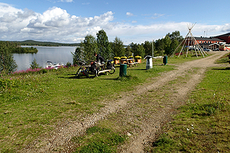 We had rain again in the early hours and slept in a bit, managing to rouse ourselves at 7:00 am. Adjusting to the change in timezone is our new excuse! Took a bit of effort to get going and do battle with the blood suckers, but they are never as bad in the morning. The weather today was really nice, cloudy but no rain and the sun came out every now and then. We also had some views today, passing many very large lakes. The road was not as flat, but gently up and down. These things make for more interesting riding. We planned to ride 80 km to Ivalo, splitting the day nicely at Inari after 40 km. We decided to book into a campsite tonight as bug avoidance is tiresome, and a hot shower is nice too. When bushcamping in Finland, you will usually have bugs to contend with in summer and this means that you can't really enjoy your campsite, you really just get in the tent and stay there. A campsite might offer indoor seating and of course a hot shower which means you do not have to expose your vulnerable bits to the insect world. The distance between river's edge and plunging into the depths can be all it takes...
