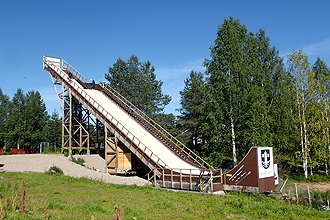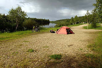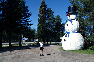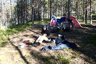 Shortley after this we passed the turnoff to Pyhä-Luoston National Park and a beautiful picnic spot. We raced into Kemijärvi and arrived at the campsite at 2:00 pm. It had really good facilities and was very quiet. We might stay for a rest day here tomorrow. We made the best of the facilities by walking into town and buying fabulous pepper steaks and then making a big fire in the grilli and having a braai/barbecue! Wow! What a winner! If we stay here tomorrow we will do the same! Next to the campsite is a summer mogul ski jump and we watched some crazy Finns zoom down, do double somersaults and twists in the air before whacking skis first into the lake! Our campsite was also visited by four sort of tame reindeer which was a bit of a surprise!