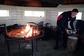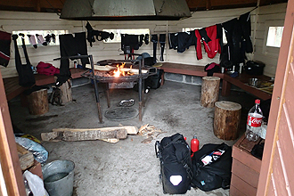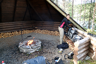 A few 100 m down the road we came to a sign showing a hike and pointed to a gravel road turn off. This correlated to a shelter symbol on our GPS map. We decided to turn off and came across a map of the area on an info board. There was a wilderness/nature school with quite a few facilities marked and also a beach with toilets, and further on the shelter which looked like a kota. We left the bikes a bit further on and walked along the track past the beach (not quite the day for it) and presently came to the kota. It was a fabulous totally enclosed building with central fireplace and glass windows all the way round. There was a store of wood and a toilet. Perfect! To think we would have paid for a cabin and this one was better and for free! We walked back for the bikes and pushed them along the track. There is an abundance of red cranberries covering the forest floor and so many kinds of mushrooms. We got the fire going and even hung up our wet gear inside. The storm whipped up the water in the lake outside but we were snug inside our little home! Not sure if we will get to pitch the tent tonight as the water is pooling all around. We might just try to sleep in here.