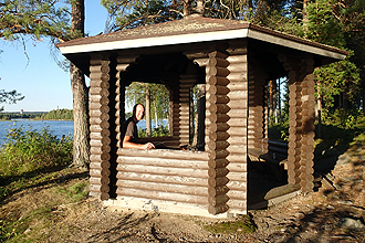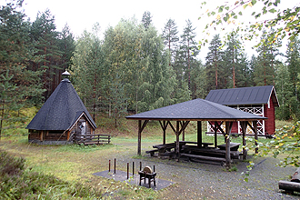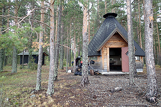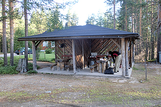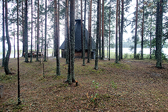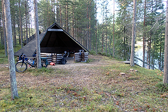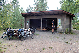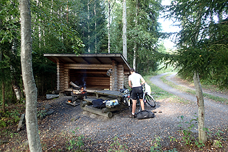 The rain continued hard all night and we were grateful for the dry warmth of the kota! It stopped in the early hours of the morning, but judging by the wind when we got up and the dark clouds, it still had a way to go! We walked out of the bush from the kota and filled up our water bottles at the nearby nature school which was very impressive in itself. It had a laavu, kota, and fire pits, etc; all very nice. A few kilometres down the road the rain started again and we were back into rain gear. I guess it is to be expected when you are almost into September in Finland! The riding was good though and we stopped for coffee in a bus stop shelter and then shopped in Kerimäki where we also ate lunch. About another 10 km on we came to the Punkaharju Resort campsite and checked in. All in all we were lucky with the weather today and hope for a clearer day tomorrow.
