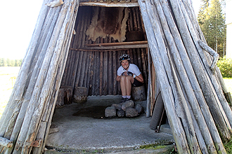 We had some rain now and then but it was a quick 32 km to Vuotsola, leapfrogging Kakslautten with it's fabulous glass Igloo Village accomodation, including glass Lavuu! We stopped at Tankavaara for a late lunch which we enjoyed at the National Park Visitor's Centre picnic area nearby. We arrived shortly thereafter at Vuotsola which is the southernmost Samí town. We found a spot to camp on the river edge and had a bracing swim. The water here in Finland is very cold! There were mozzies but we dealt with them quick smart with our can of Raid. We have often debated it but never done it, however in the interests of surviving to Helsinki we bought it. And it works. A few sprays and the mozzies lurking under the flysheet gave up and disappeared. Yay for us!