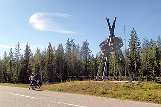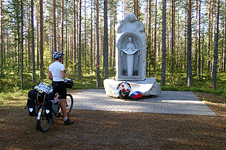 It was hard to leave our beautiful campsite, especially as we woke to see mist rising off the lake and clear blue skies. It had grown cold and darker overnight, it feels that the seasons are changing now and that we are shifting closer to home with the days and nights behaving as they should. We noted that now there is a definite sunset and sunrise and the night is suddenly longer; sun setting at around 10:00 pm and rising at 4:30 am. We had a wonderful quiet night's sleep and today we were off to Kemijärvi, just short of 100 km away. We looked forward to the metropolis! The day started with rolling hills, but nothing too arduous and then from Pelkosenniemi we followed the Kemijoki (river) so once again made brilliant time with an average speed for the day above 20 km/h. We passed a monument to the Finns and Russians who fell in the Winter War of 1939.