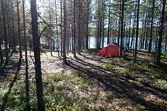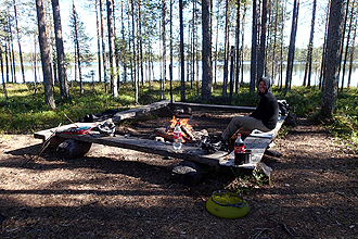 We had a further 55 km to ride after this and the road was still quietish, still lined with fir tree forest and still dotted with reindeer from time to time. Cycling in Finland sure gives you time to think of other things. From time to time Mike uses his new app to translate stuff we see on signboards and things become clearer! We had seen a sign showing where a "Veenenlaskupaikka" was since we arrived in Finland and now we know this is a boat ramp! Cool, but pointless, hey! We are becoming fluent Finnish speakers! Then only 2 km before the turn off to the campsite we came apon a great bush camp. We pitched the tent high up on a pine needle-strewn piece of earth and had a good swim in the lake. Then we got our grilli going and, tiny thing that it was, it was able to cook 4 steaks, toast two cheese and tomato rolls and roast a bag of marshmallows! Pretty efficient stuff. It was lovely sitting out in a bug free environment. It was a warm, dry afternoon and evening with a slight wind.