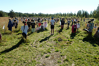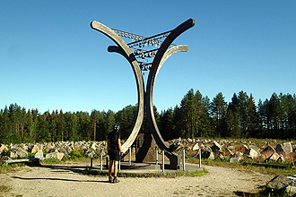 We have to say that the day's ride was boring. We had hoped for a shop which was marked on a roadside map at about 35 km but there was no sign of it. We stopped at a picnic site at a river with a small memorial of the place where the Finns defeated the mighty Soviet Union in the Winter War 1939. We expect to see more of these markers after Suomussalmi. It is interesting to read about the history of Finland, particularly pertaining to independance from Russia. Then about 30 km further on we passed a closed tearoom with an amazing installation artwork in the field next door, entitled "The Silent People". It was very effective and pretty creepy. It is 1000 people made of wooden sticks with grassy mounds on their heads. They are faceless and dressed in old clothes and all facing the road. Kind off like a crowd of scarecrows. How weird, or perhaps fitting that on a stretch of road with nothing going on, this thing emerges!