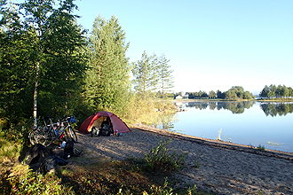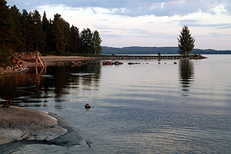 Suomussalmi surprised us by being a lovely town with a good visitors centre and fabulous swimming place on the lake shore. Beautiful lawns and a frisbee golf course. All in use by sun-hungry Finns. The Frisbee Golf courses are really nice to see and they are always well used. They are common in Scandinavia. We whiled away the afternoon on the lawn after shopping at the large K-Supermarket. We filled up with plenty of water at the visitors centre and around 7:00 pm we moved round the lake to a little beach where we made camp for the night.